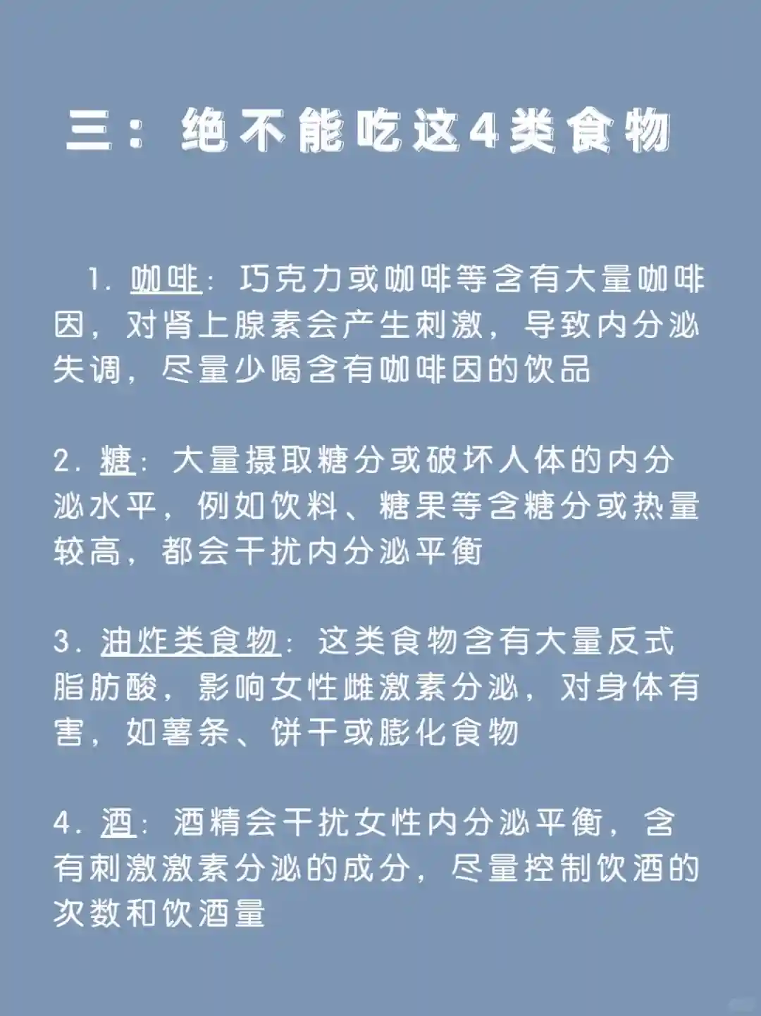 1. 咖啡:巧克力或咖啡等含有大量咖啡因,对肾上腺素会产生刺激,导致内分泌失调,尽量少喝含有咖啡因的饮品