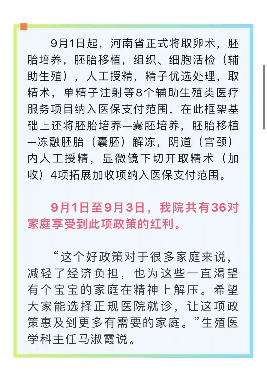 9月1日至9月3日,妇幼共有36对家庭享受到此项政策的红利。“这个好政策对于很多家庭来说,减轻了经济负担,也为这些一直渴望有个宝宝的家庭在精神上解压。希望大家能选择正规医院就诊,让这项政策惠及到更多有需要的家庭。” 社区🏠故事 14