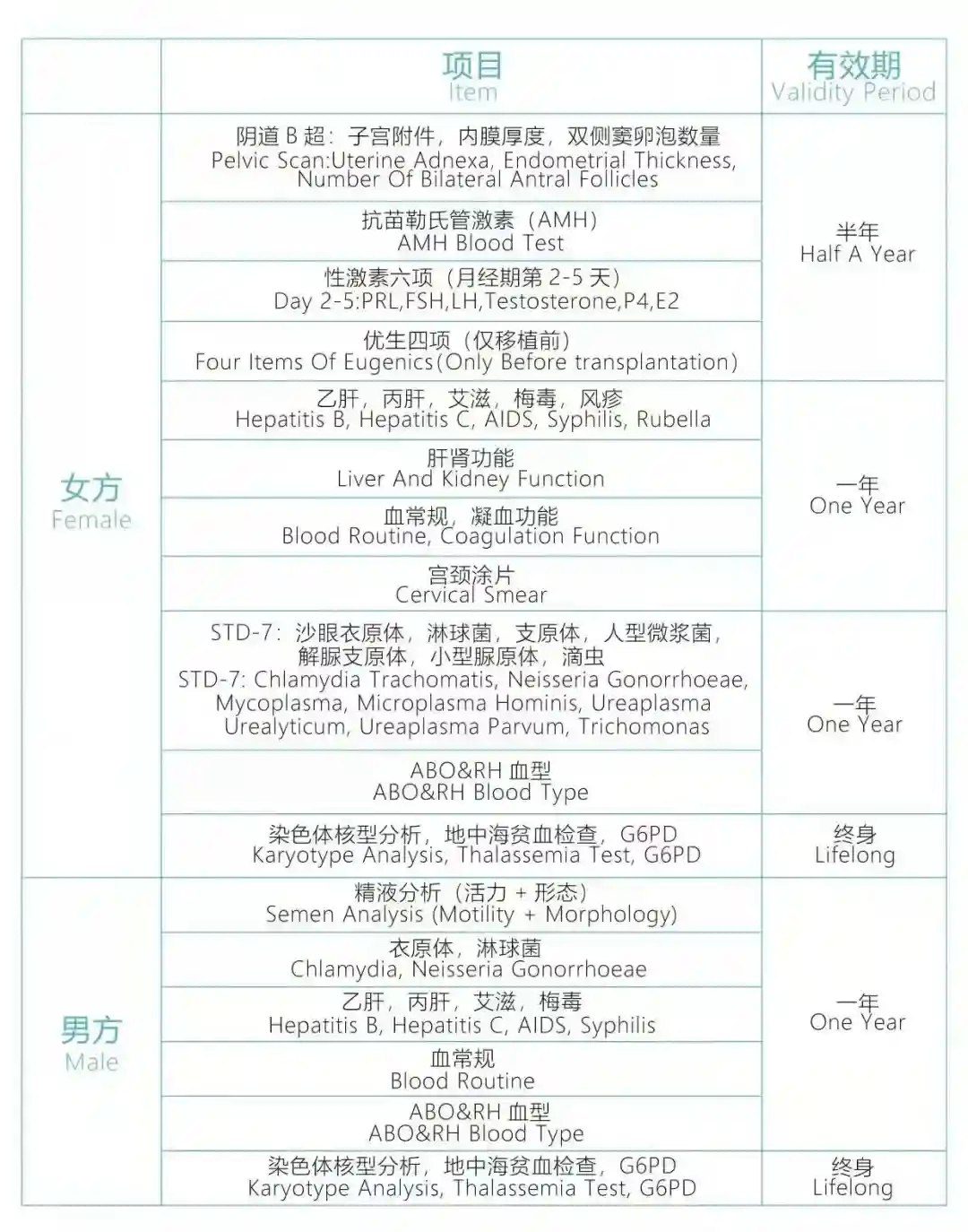 男方的染色体核型分析、地中海贫血检查、G6PD 检查同样终身有效。