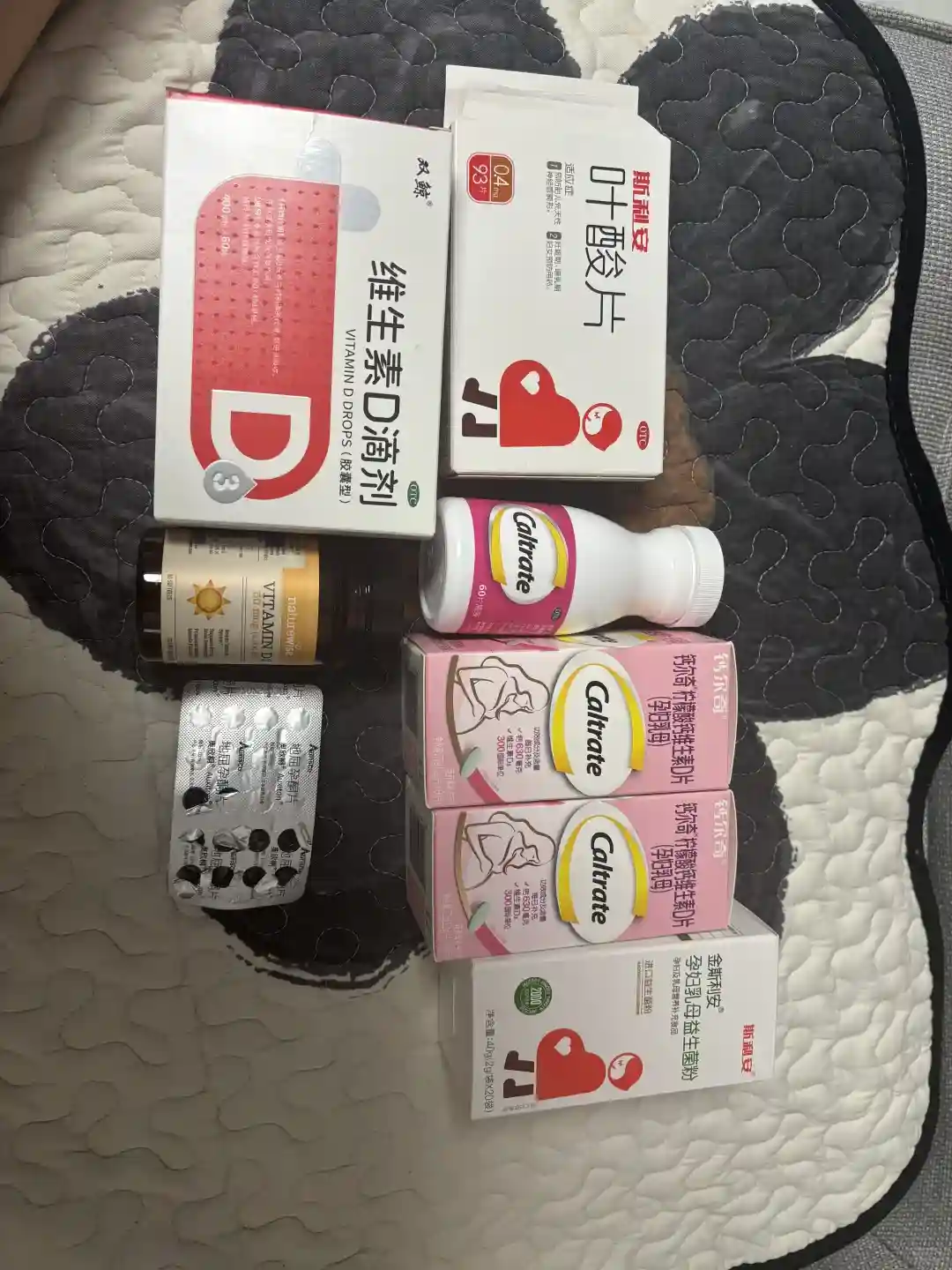 维生素D:阳光瓶。VC:小药粒。铁:红源达,琥珀酸亚铁。DHA:爱乐维。叶酸:斯利安。钙片:钙尔奇。