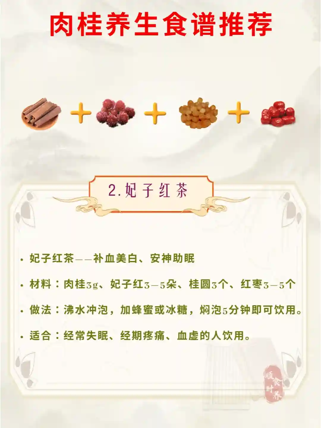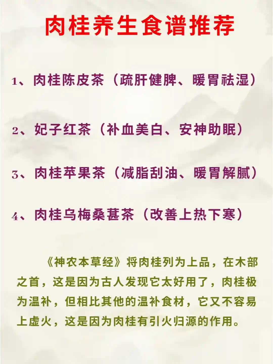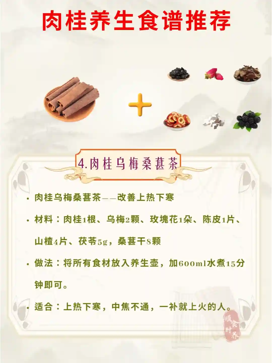 适合:上热下寒,手脚冰凉的人饮用。、肉桂乌梅桑葚茶——改善上热下寒