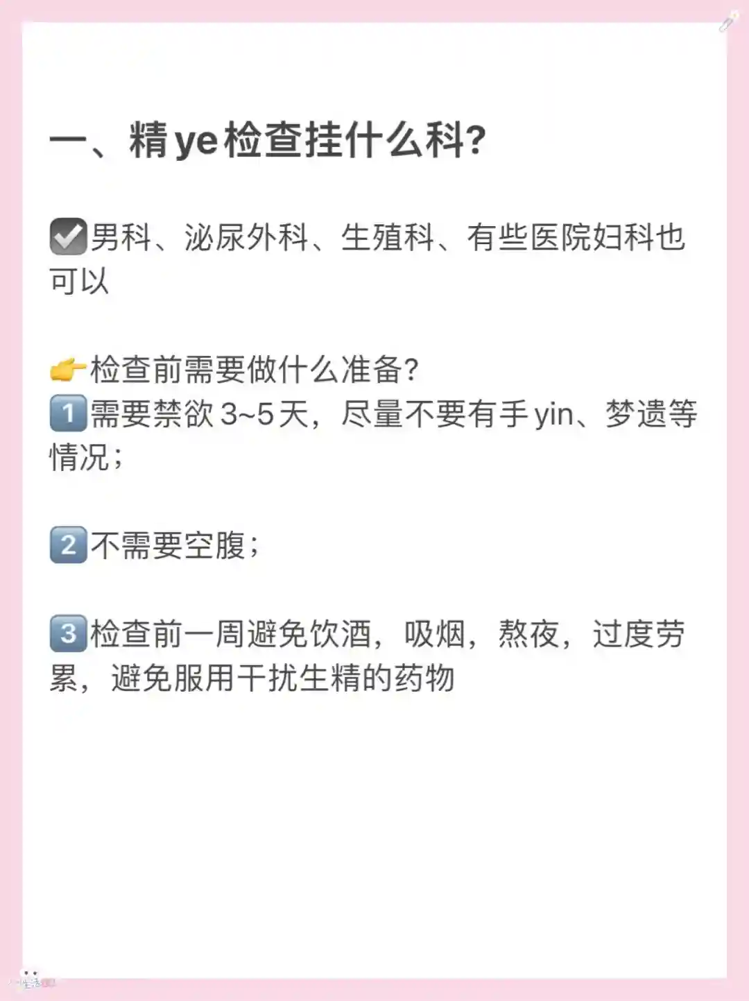 3️⃣检查前一周避免饮酒,吸烟,熬夜,过度劳累,避免服用干扰生精的药物