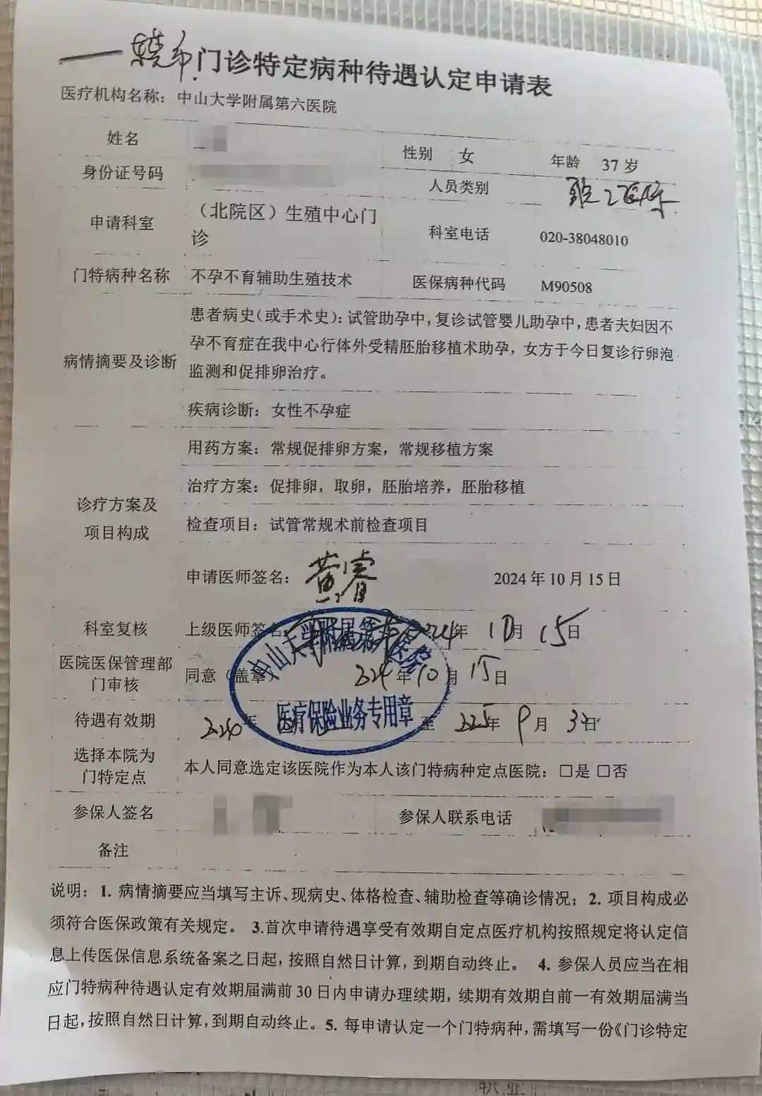 2、已办理异地医保备案后,直接去广州中六北院生殖中心门诊挂号,前期做过检查或治疗,跟医生说异地医保定点,护士会帮忙打印图2的申请表并让医生签字。