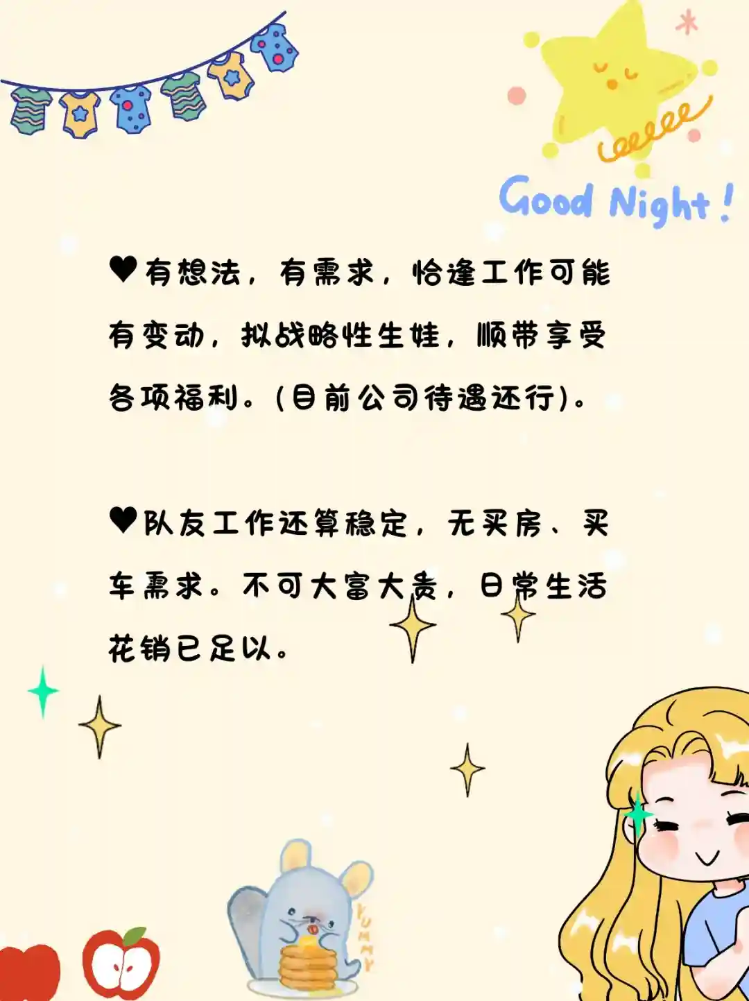 ♥队友工作还算稳定,无买房、买车需求。不可大富大贵,日常生活花销已足以。
