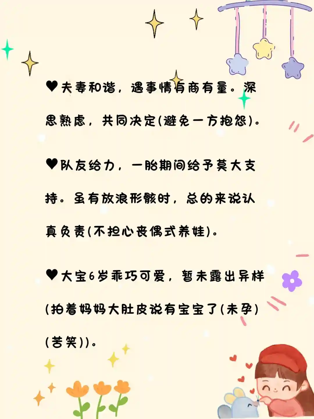 ♥大宝6岁乖巧可爱,暂未露出异样(拍着妈妈大肚皮说有宝宝了(未孕)(苦笑))。♥婆婆无私,支持二胎,愿意远道而来帮忙带娃(十分感谢)。