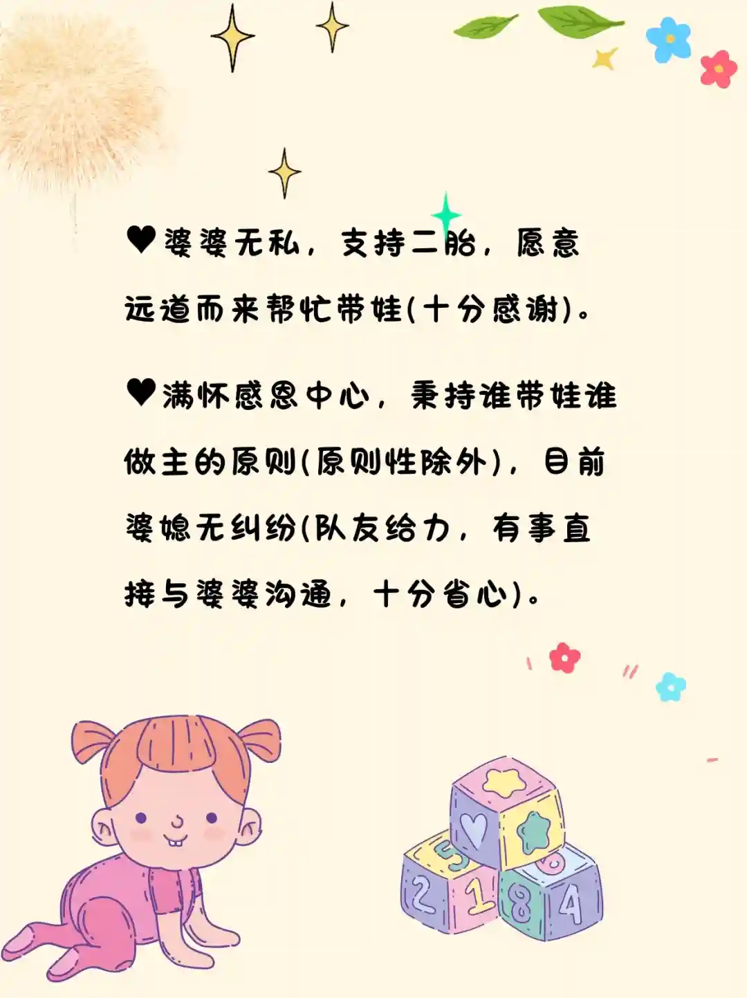 ♥满怀感恩中心,秉持谁带娃谁做主的原则(原则性除外),目前婆媳无纠纷(队友给力,有事直接与婆婆沟通,十分省心)。