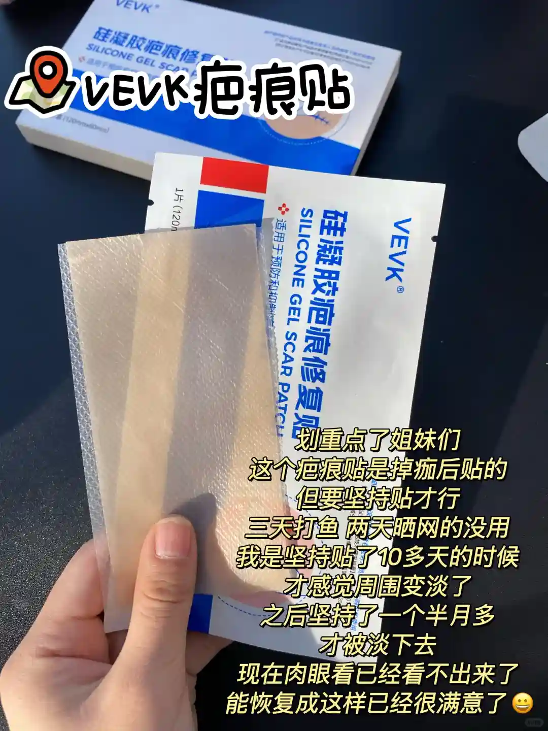 5.祛疤护理:伤口掉痂后开始贴疤痕贴了,我用的是VEVK疤痕贴,里面含有硅凝胶成分,可以淡化疤痕,抑制增生,但要坚持贴才行,三天打鱼 两天晒网的没用,我是坚持贴了10多天的时候,才感觉周围变淡了,之后坚特了一个半月多才被淡下去,现在肉眼看已经看不出来了,能恢复成这样已经很满意了。