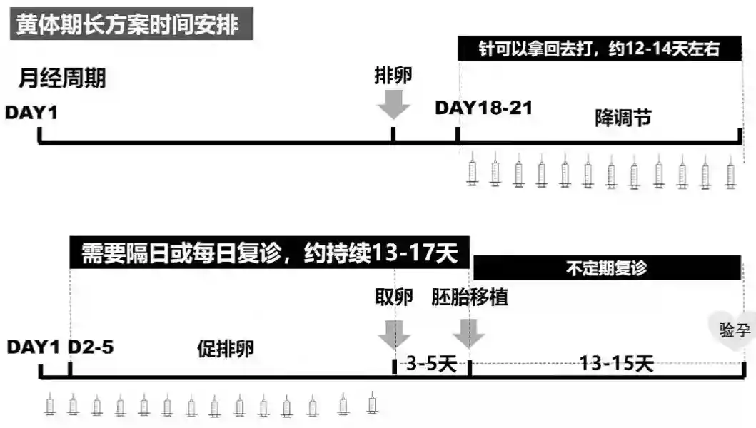 超长方案。月经第2天打达菲林或亮丙瑞林降调针,28天后根据卵泡和激素情况开始用促排药(降调后会不来月经),这个方案适用于基础卵泡大小不一、卵泡相对较多的人,降调能够降低激素,确保卵泡能同时成熟,但可能会出现降调后基础卵泡变少的情况。