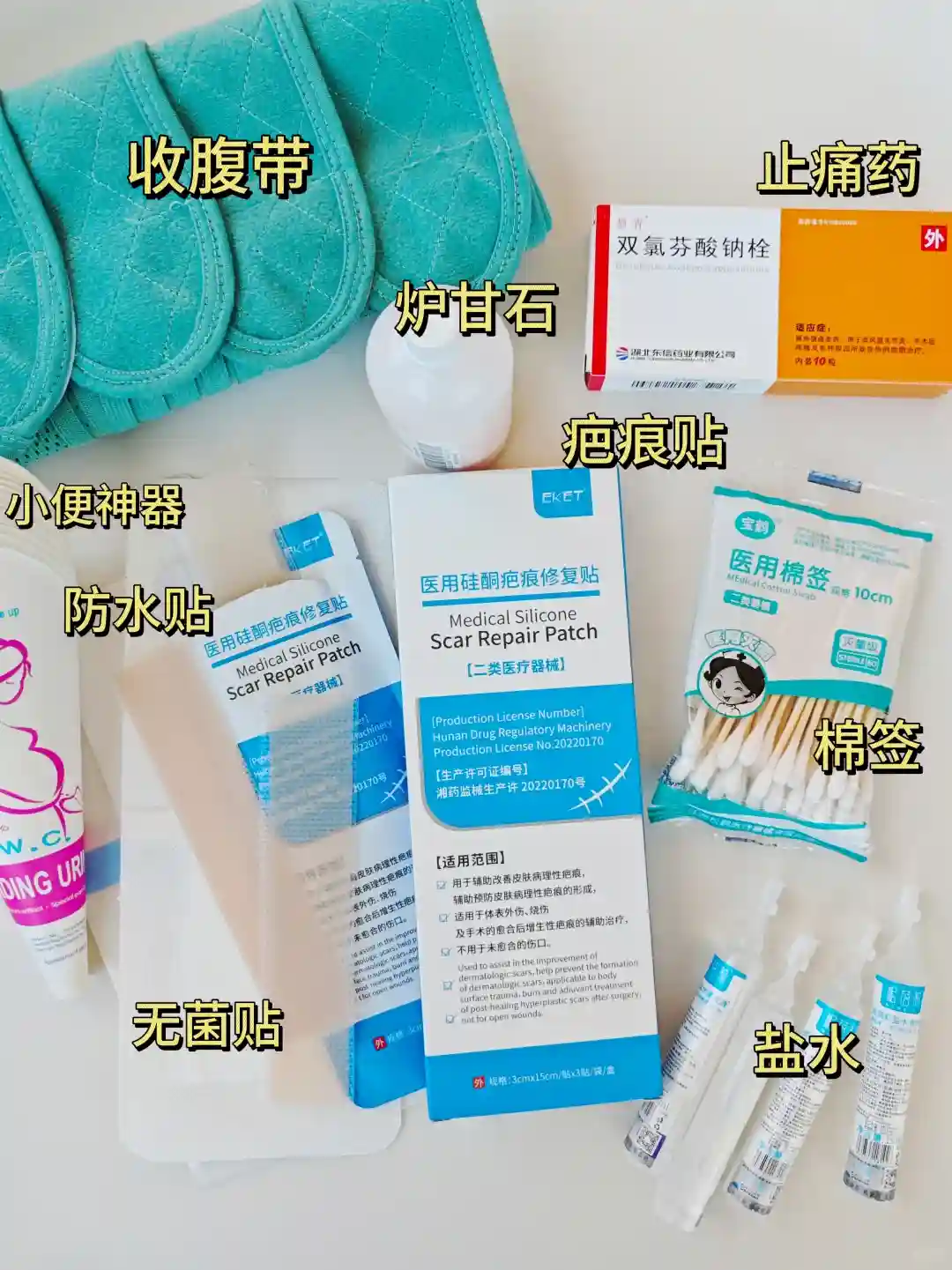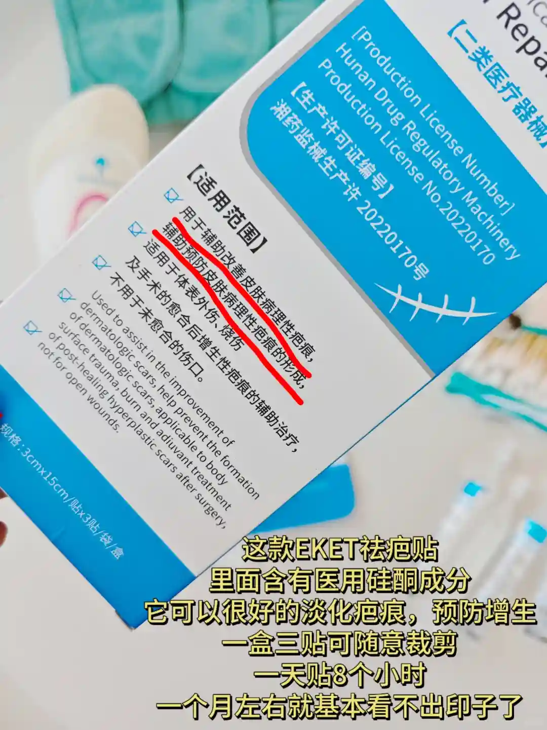 1.EKET疤痕贴 伤口愈合后掉完痂就可以开始用祛疤贴了,添加了医用硅酮成分还很温和,哺乳期也可用,不仅能淡化疤痕还能抑制增生!每天早中晚各涂一次,效果也不错~