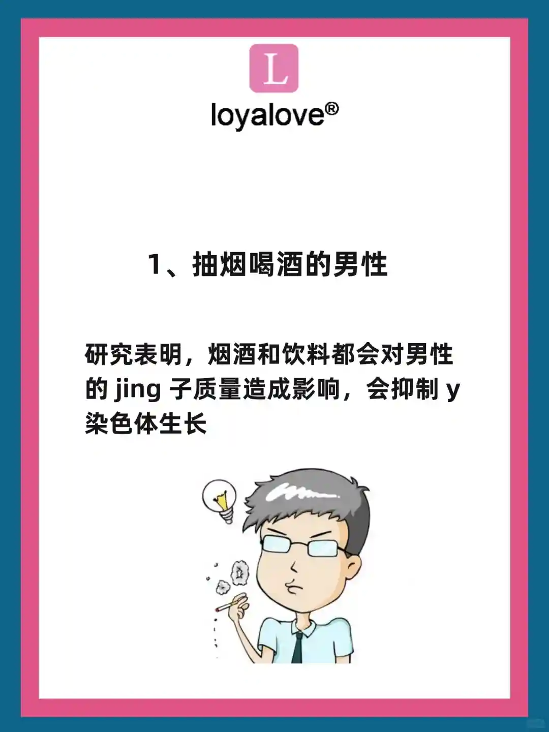 研究表明,烟酒和饮料都会对男性的 jing 子质量造成影响,会抑制 y 染色体生长