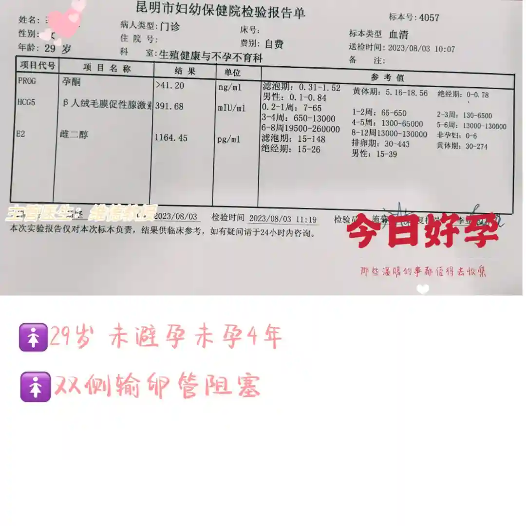 好孕报喜:2023年4月起到昆明市妇幼保健生殖中心“试管婴儿”助孕治疗,1促1移获好孕!8.3验孕,HCG:391 IU/L