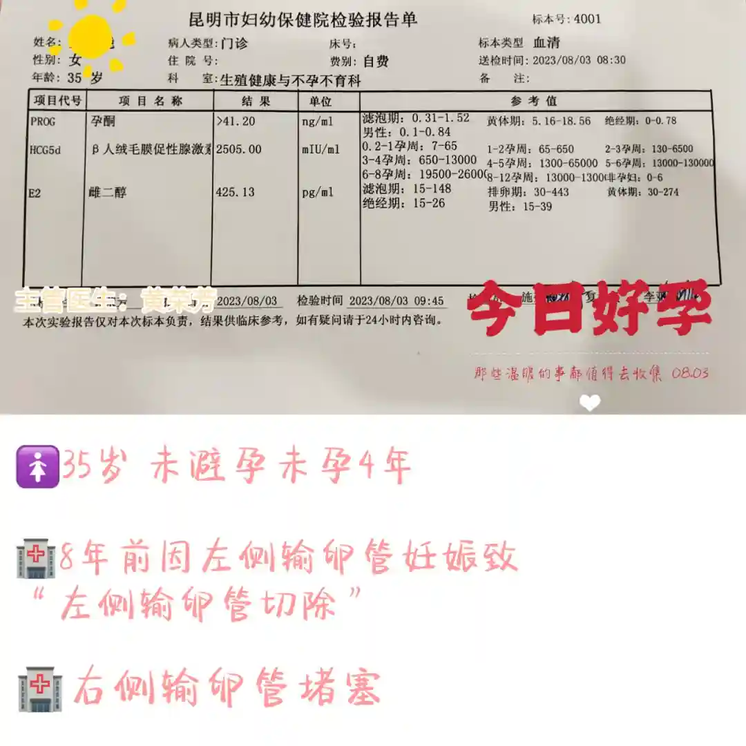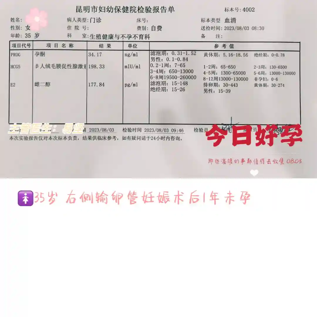 好孕报喜:2023年4月起到昆明市妇幼保健生殖中心“试管婴儿”助孕治疗,1促1移获好孕!8.3验孕,HCG:198 IU/L