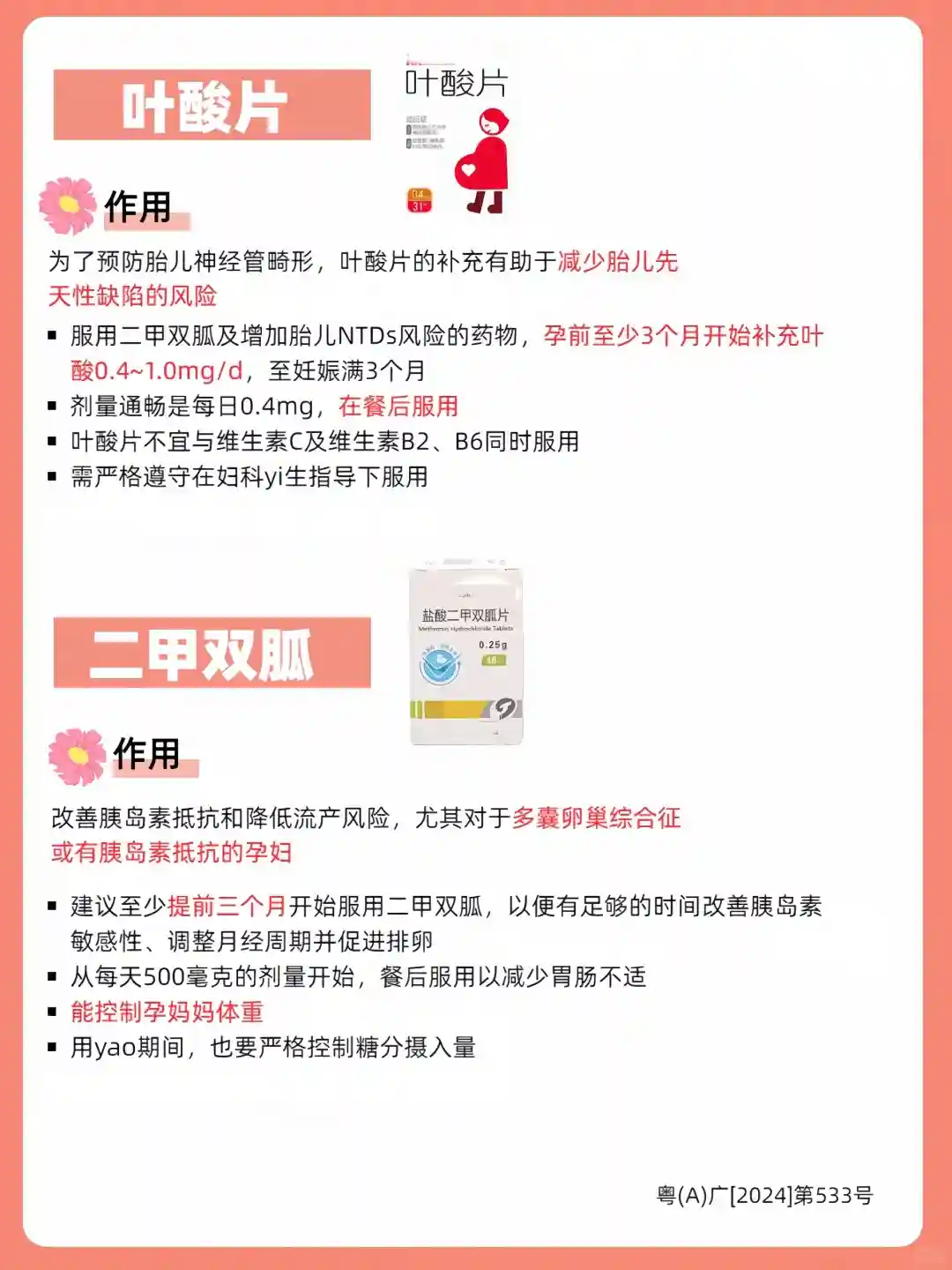 💊二甲双胍作用:改善胰岛素抵抗和降低流产风险,尤其对于多囊卵巢综合征或有胰岛素抵抗的孕妇