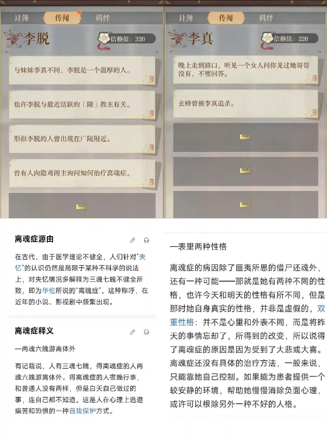李真曾说亲手杀了哥哥,但哥哥却在绣衣楼出现(切换另一个人格时)李脱应该知道他们是一体双魂,所以才咨询怎么治疗离魂症