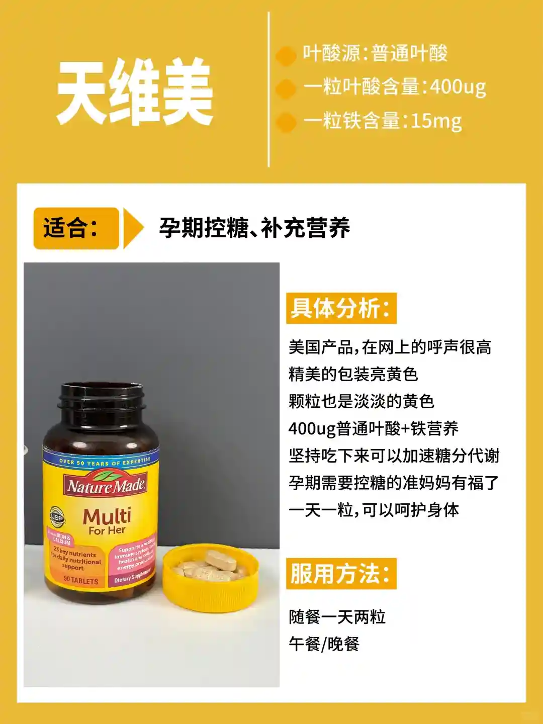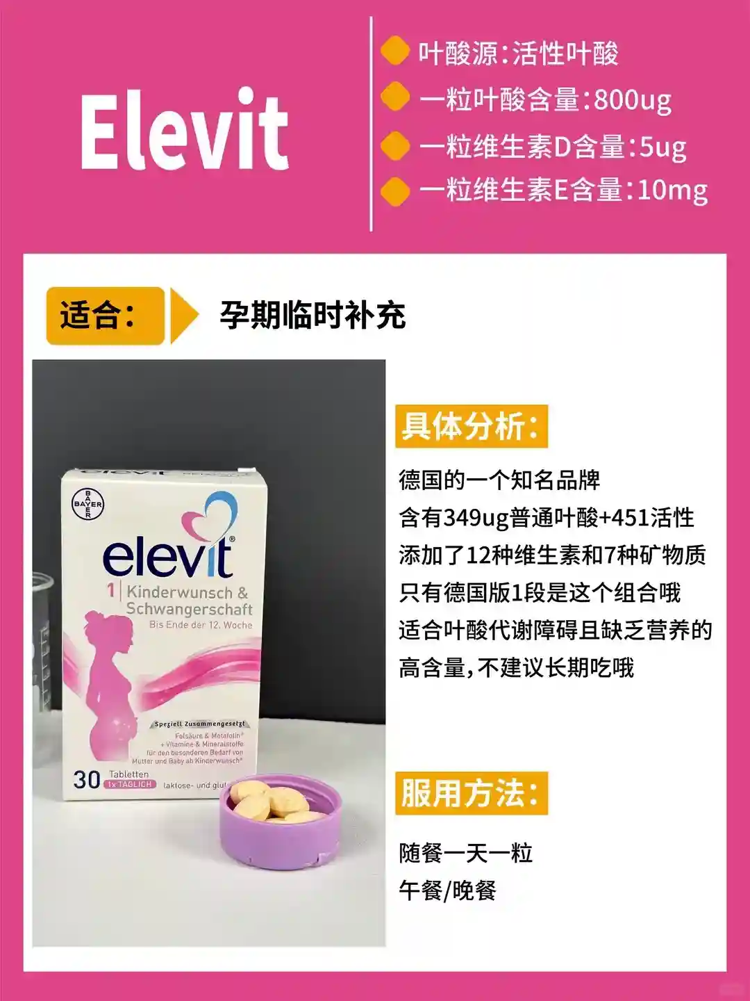 很多人都知道它,知名度较高,在各大药店都能买到。它的叶酸含量比较高,适合大多数叶酸障碍人群,没有过多复杂的复配,对于那些只是想单纯补充叶酸,没有特殊营养需求的姐妹来说是个不错的基础选择。