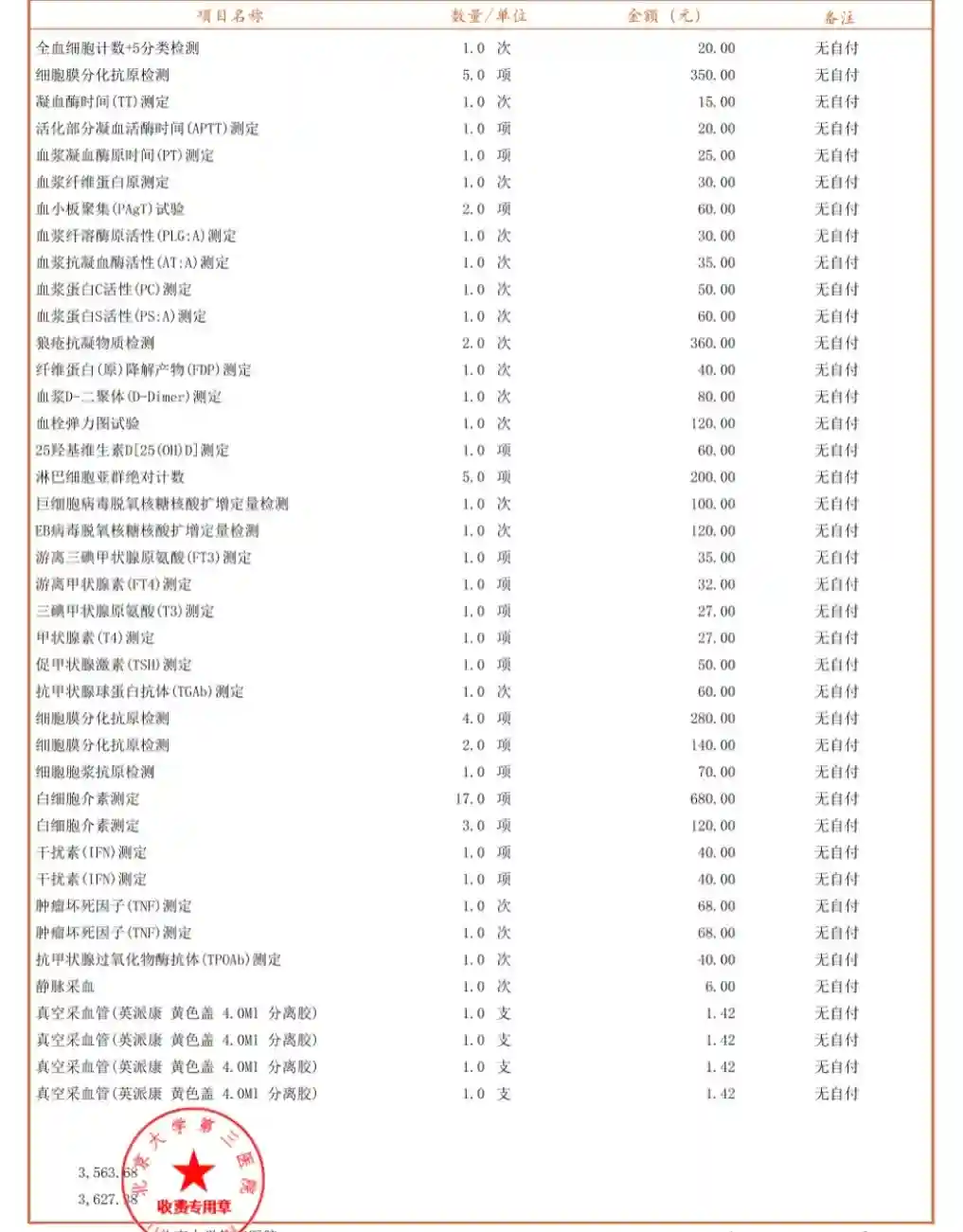 开具检查:甲功七项(271元);T细胞内细胞因子检测(508元);调节性T细胞检测(210元);血清细胞因子检测(788元);25-维生素D(60元);淋巴细胞亚群(550元);凝血III(210元);同型半胱氨酸(50元);血栓弹力图组合1(120元);血小板聚集率组合(60元);易拴症组合(535元);血常规(20元);人巨细胞、EB病毒核酸检测组合(220元)。