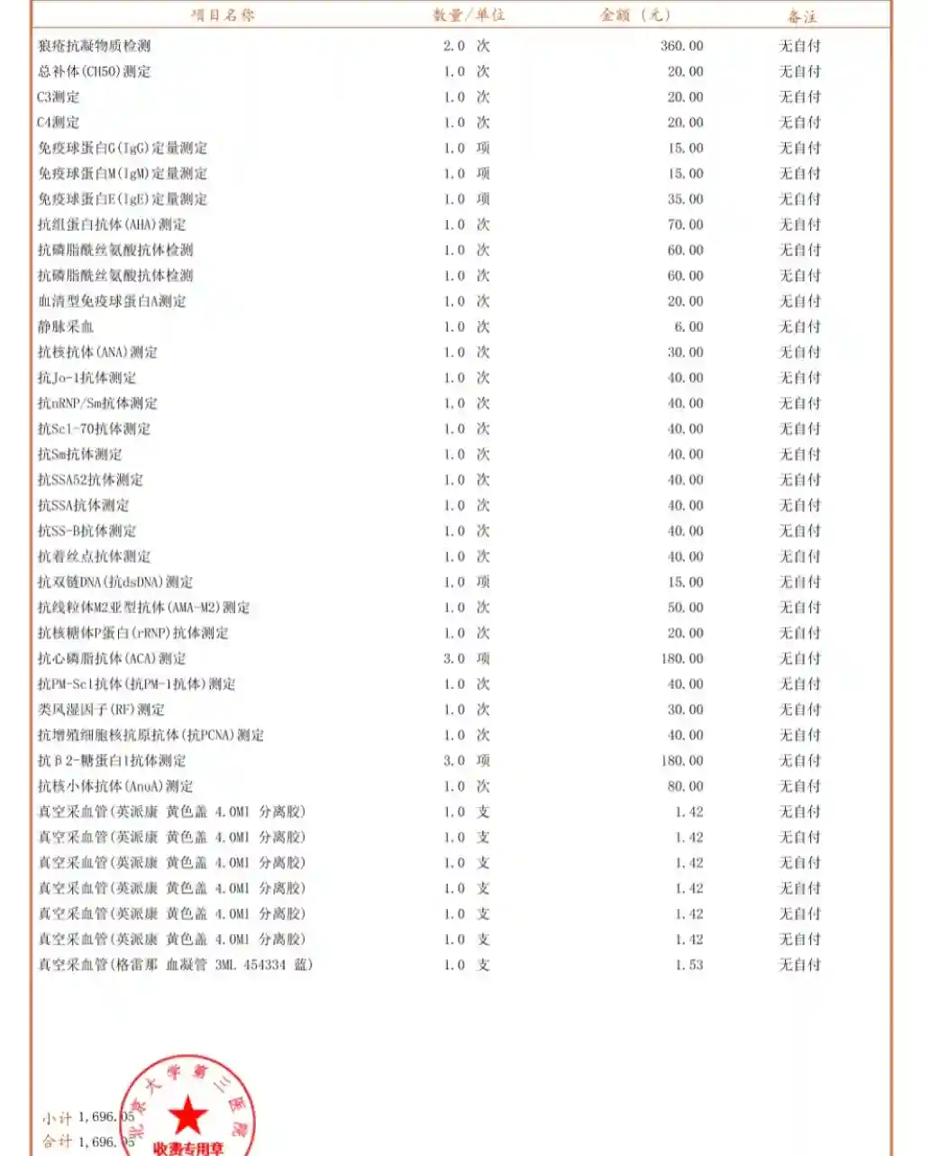 为了能走医保,我分别在北医三院挂了风湿免疫科和血液科凑这些检查。如下是我在2个科室开的检查明细和费用,仅供参考!