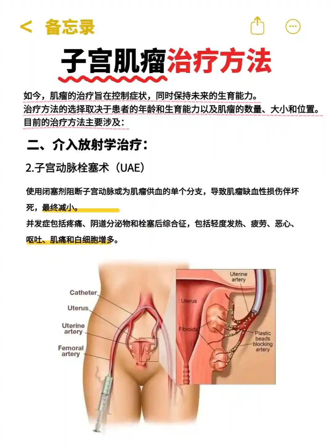 四、微无创治疗:1.子宫动脉栓塞术(UAE):通过堵塞供血动脉,抑制肌瘤生长。