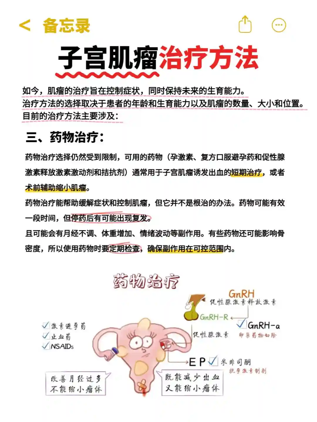 药物治疗主要用于缓解症状,控制肌瘤生长。常见药物包括促性腺激素释放激素类似物、复方口服避孕药、孕激素等。虽然这些药物可以缓解症状,但效果通常是短期的,并无法从根本上治愈肌瘤。