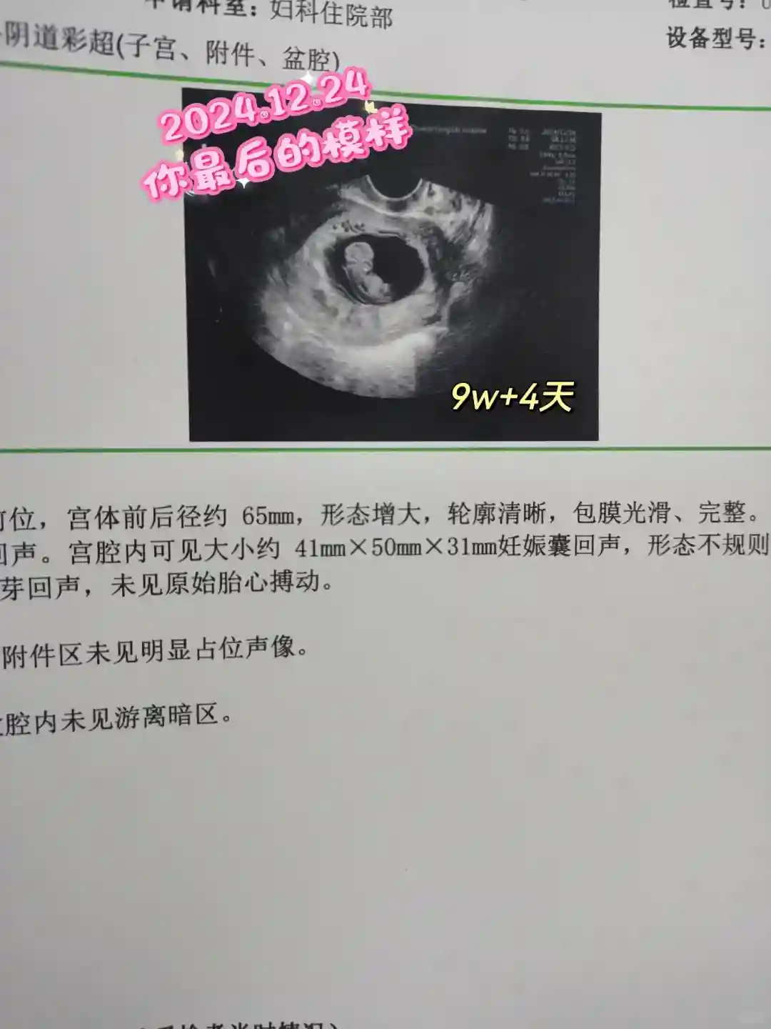 今年4月底开始决定试管,5-6月术前一系列检查及调理!抽不完的血,吃不完的药,打不完的针!7月进周促排,16日取卵,获得12枚卵,胚胎配置中,医生打电话告知需要由一代转二代,最终配置6枚胚胎,2枚冻胎,其余4枚养囊全军覆没!因为促排后体内激素过高,不适合移植鲜胚,医生建议做宫腔镜检查后再移植。于是8月宫腔镜检查,子宫慢性炎症2个➕,吃奥硝挫和多西环素14天,9月复查+修养,10月进冻周,10.22日移植了两枚冻胎,8天后试纸测试,白板,伤伤心心的哭了一场,本以为失败了,却在12天的晚上测出强阳,又给了我希望,但是心里一直很忐忑,14天后官宣血值四百多。11月初感冒,住院,发烧最高至38.8℃,因为是试管医生一直没敢开药,经历十多天后,我也终于熬过来了。11.22中午出血,23日有模糊不清的血肉就出来,应该是其中一个胚胎流了,11.24日我第一次听见了胎心,当时激动的想录下来给老公也听一听。12.2和12.9也如期返院复查,一切正常,只是一超,二超,三超,我都比一起移植的姐妹小一周。昨天四超,医生说检查没问题就准备建档了,结果却得到胎停的结果,胚芽27mm,预测9+4(12月18日)胎停。不敢接受,这两天都像做梦一样,医生安排的今天手术,在手术之前,我不死心又坚持再做一遍B超,我想给你也给我自己一个机会,可是却等来一样的结果,看着B超中的你已经有了人形,每每想起你蜷缩的模样就经不住泪流。我绝望的被推上了手术台,望着手术灯,心里一直默念,宝贝别怕,妈妈在陪着你,一定要记住妈妈的模样!醒来时,你已经永远的离开我了。我不知道你有没有看我一眼,以后还会不会再回来。