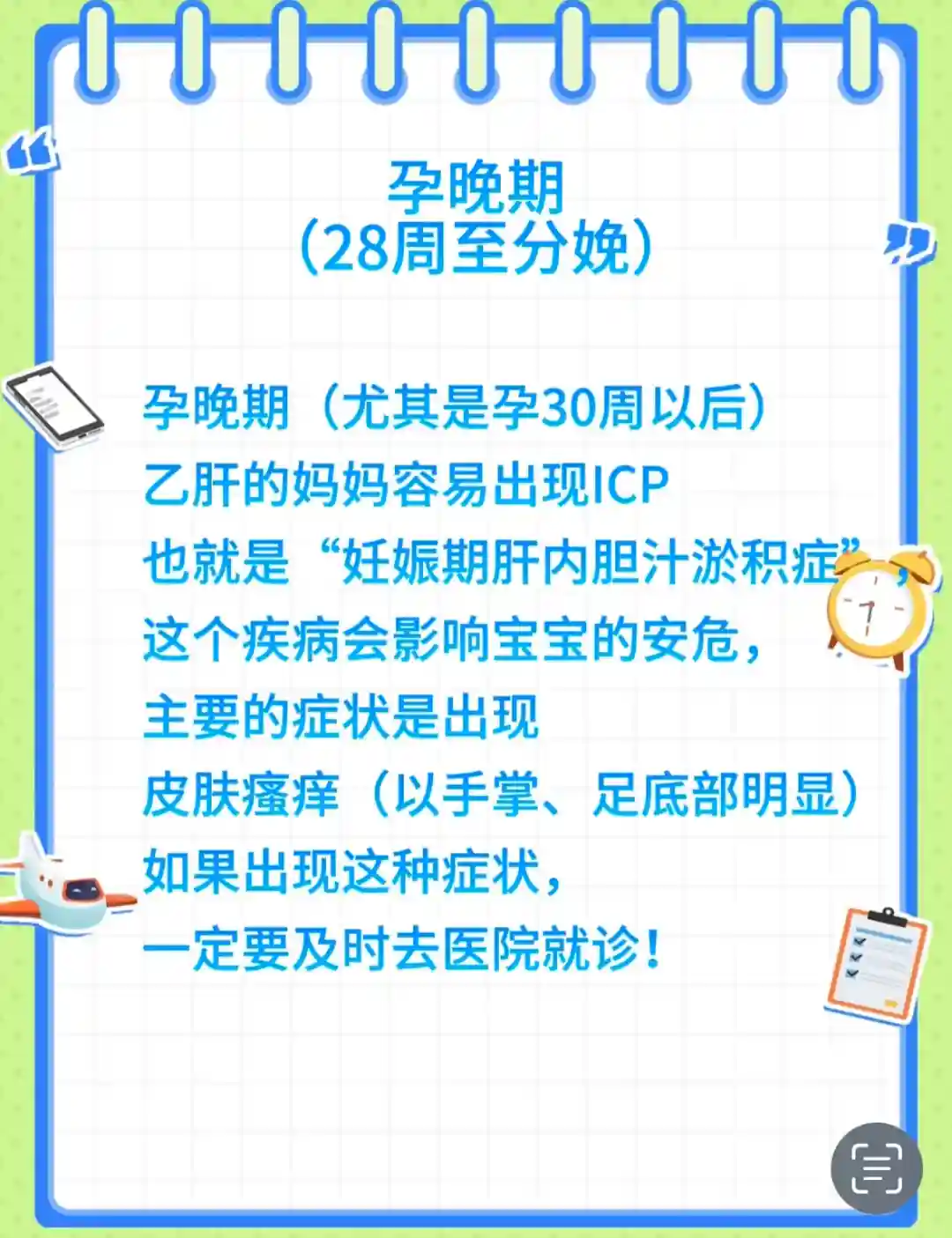 孕晚期(尤其是孕30周以后),乙肝的妈妈容易出现ICP,也就是“妊娠期肝内胆汁淤积症”,这个疾病会影响宝宝的安危,主要的症状是出现皮肤瘙痒(以手掌、足底部明显),如果出现这种症状,一定要及时去医院就诊!孕晚期接近分娩住院的时间,一定要告诉医生,自己患有乙肝(绝不要隐瞒哦),这样宝宝出生后,