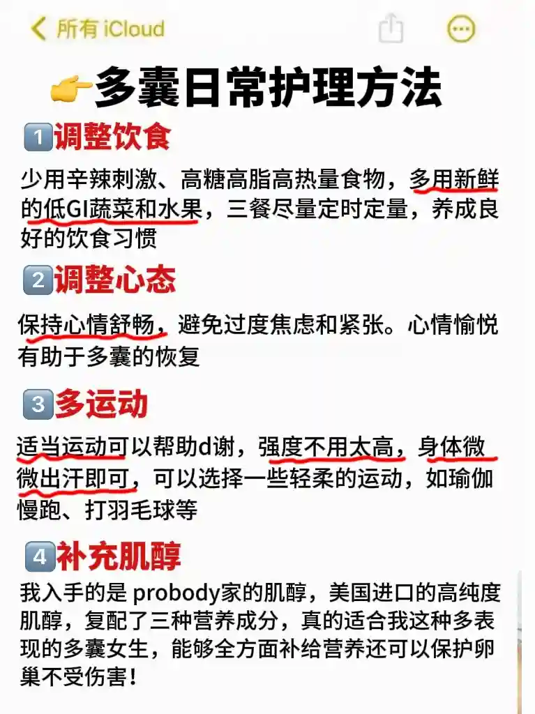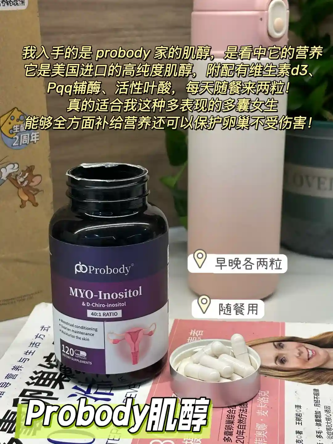 我入手的是 probody 家的肌醇,是看中它的营养,它是美国进口的高纯度肌醇,附配有维生素d3、Pqq辅酶、活性叶酸,每天随餐来两粒!真的适合我这种多表现的多囊女生,能够全方面补给营养还可以保护卵巢不受伤害!