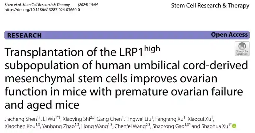 2024年3月,同济大学附属妇产科医院徐韶华主任医师/高绍荣院士团队在Stem Cell Research & Therapy杂志在线发表了题为“Transplantation of the LRP1high subpopulation of human umbilical cord-derived mesenchymal stem cells improves ovarian function in mice with premature ovarian failure and aged mice”的研究论文。