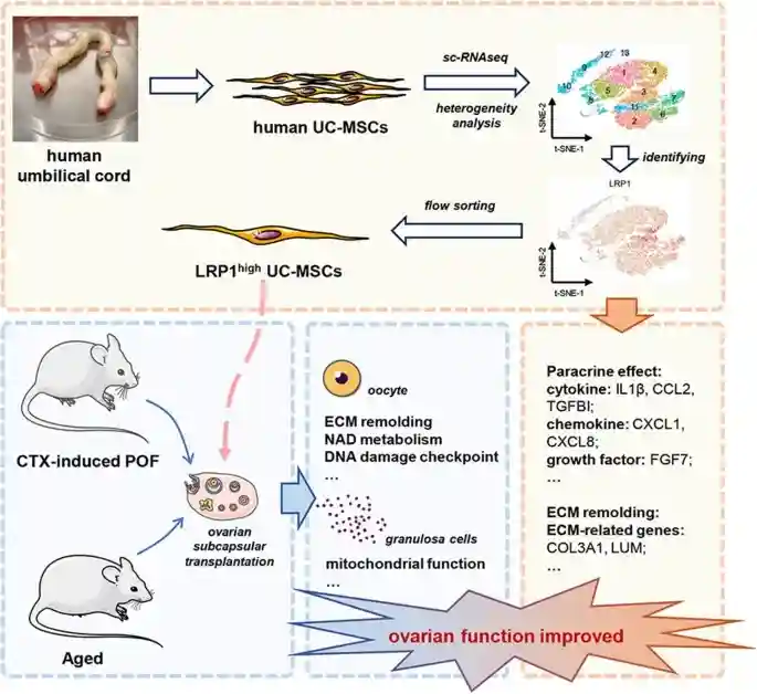 该研究从脐带来源的间充质干细胞(UC-MSCs)中分离到LRP1high亚群,将这群细胞对卵巢早衰小鼠及老年小鼠行卵巢包膜下移植后,发现小鼠的血清激素水平、卵巢卵泡数量和后代胚胎及产仔数量等卵巢功能显著恢复。综上所述,这种特定的细胞亚群有望为卵巢早衰的干细胞精确治疗提供新的见解。