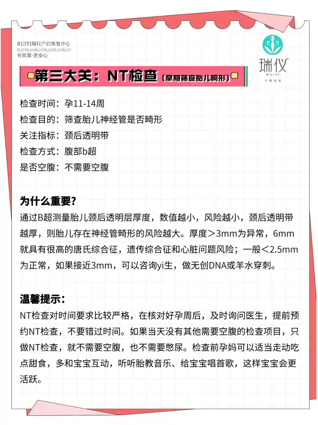 ·孕 11 - 14 周:NT 检查,腹部 B 超测颈后透明带,<2.5mm 正常,临近 3mm 咨询大白,超 3mm 警惕风险,按时预约别错过⏰