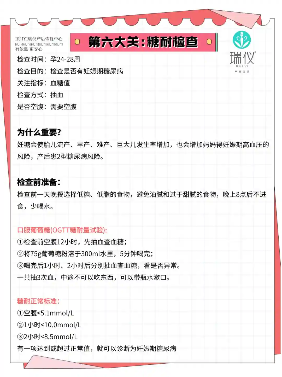 孕 24 - 28 周:糖耐(空腹)查妊娠糖尿病,前一晚低糖低脂,8 点后禁食少水,喝糖水后按点抽血,控糖很重要