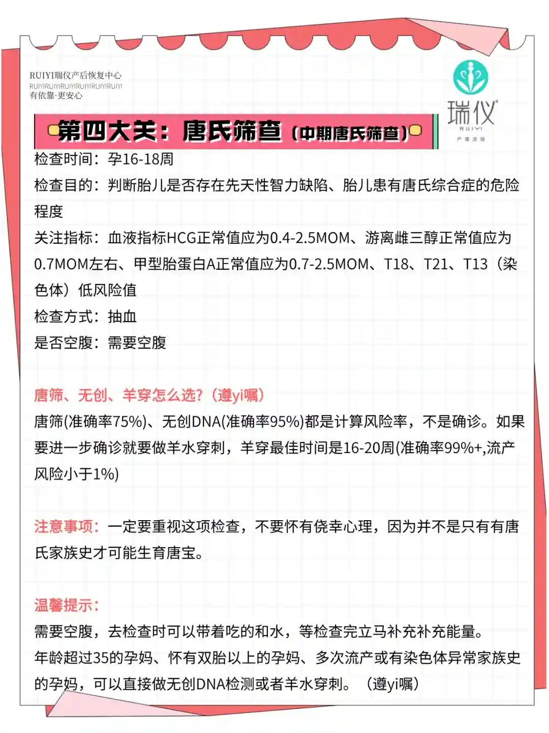 孕 16 - 18 周:唐筛(空腹)查智力缺陷,唐筛、无创、羊穿按需选,高龄双胎等特殊情况遵yi嘱选无创或羊穿