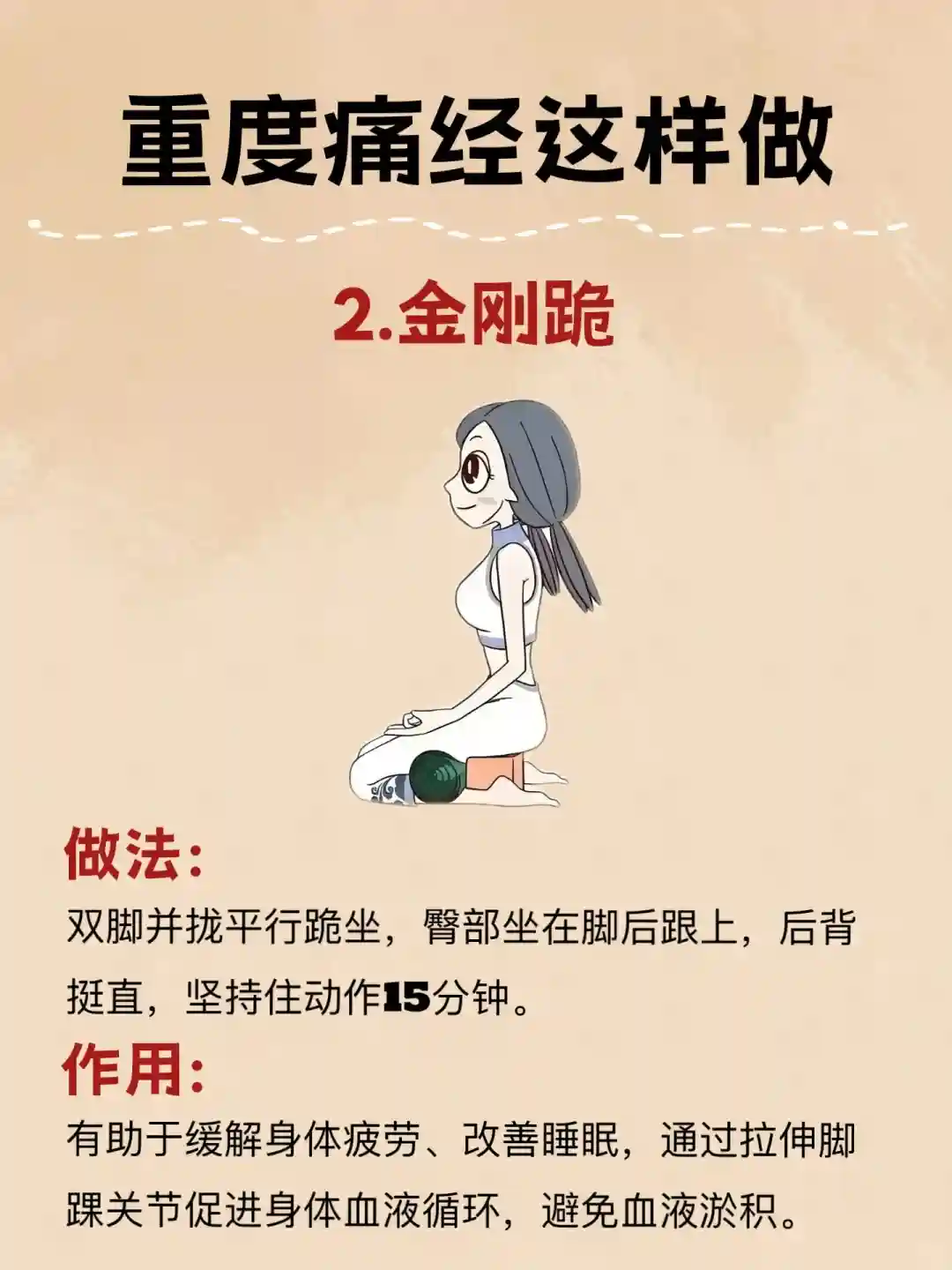 2.金刚跪:有助于缓解身体疲劳、改善睡眠,通过拉伸脚踝关节促进身体血液循环,避免血液淤积。