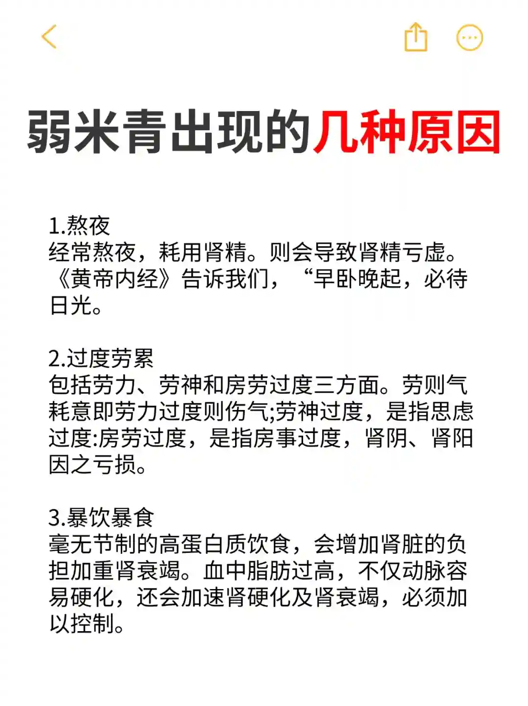 经常熬夜,耗用肾精。则会导致肾精亏虚。《黄帝内经》告诉我们,“早卧晚起,必待日光。