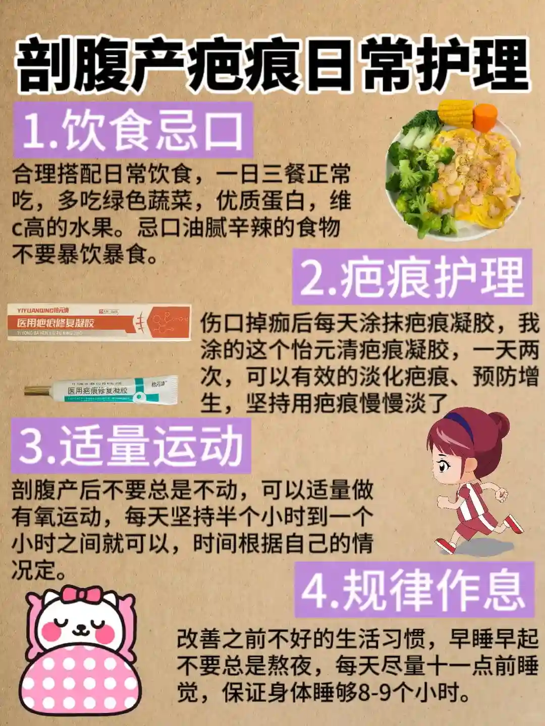 因为是第一胎所以也没什么经验,刚出月子的时候伤口愈合的也挺好的,没想到一个月后疤痕竟然增生了,毫不夸张又红又痒的,趴在肚子上跟个肉虫似的,我自己看的直发愁😫去查才知道是我的放任不管导致疤痕增生了。后来我就打起精神认真去做功课,中间也是踩了无数次雷,好在找对了方法,现在肚子上恢复的只剩一条白线了