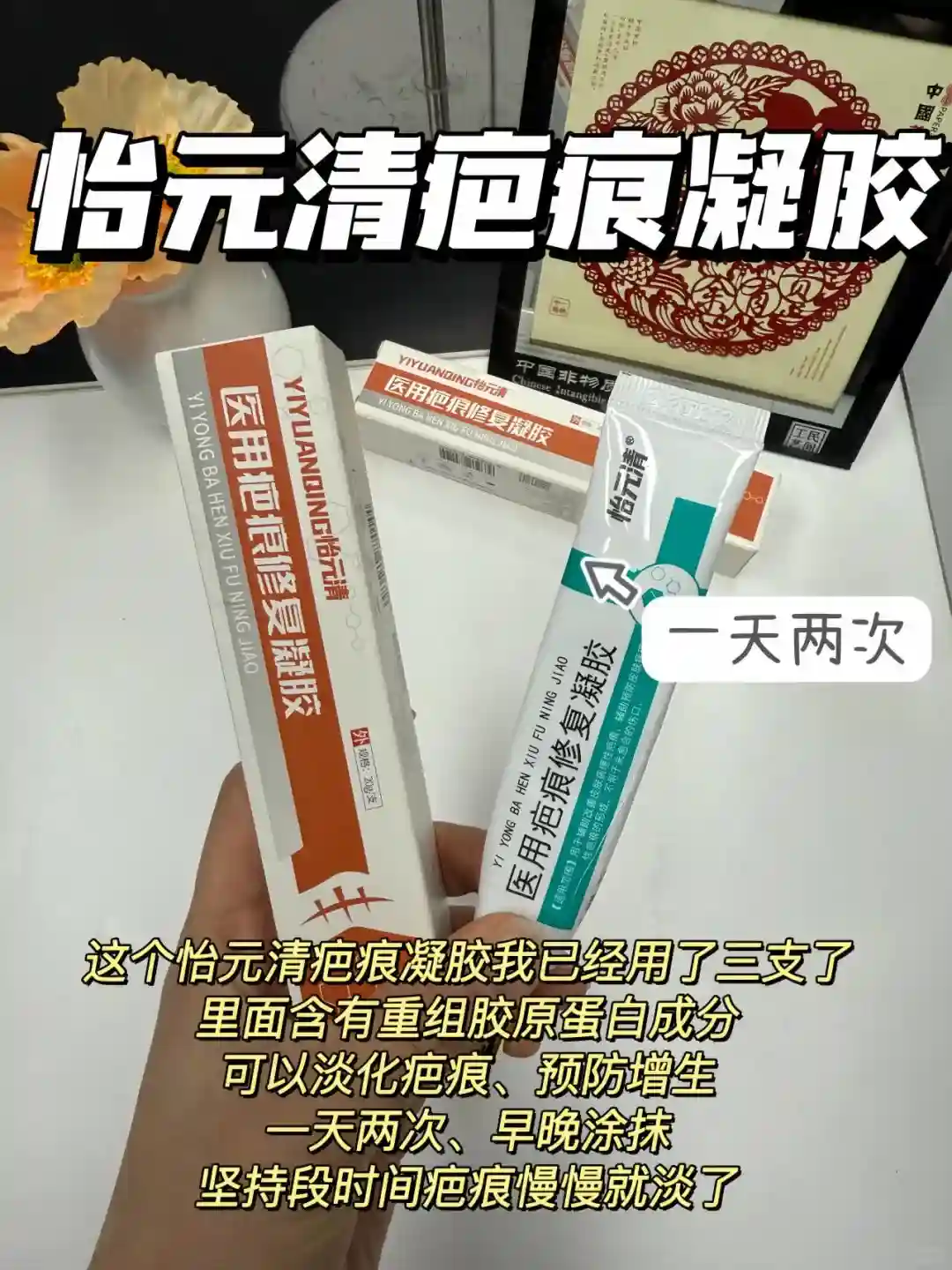 伤口掉痂后每天涂抹疤痕凝胶,我涂的这个怡元清疤痕凝胶,一天两