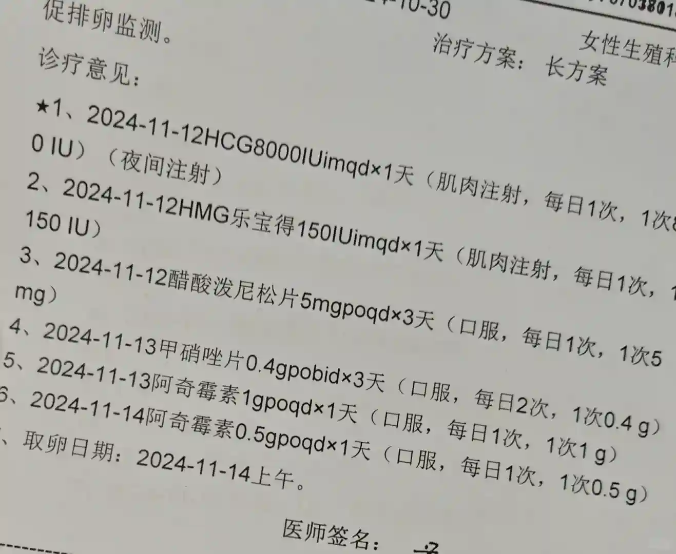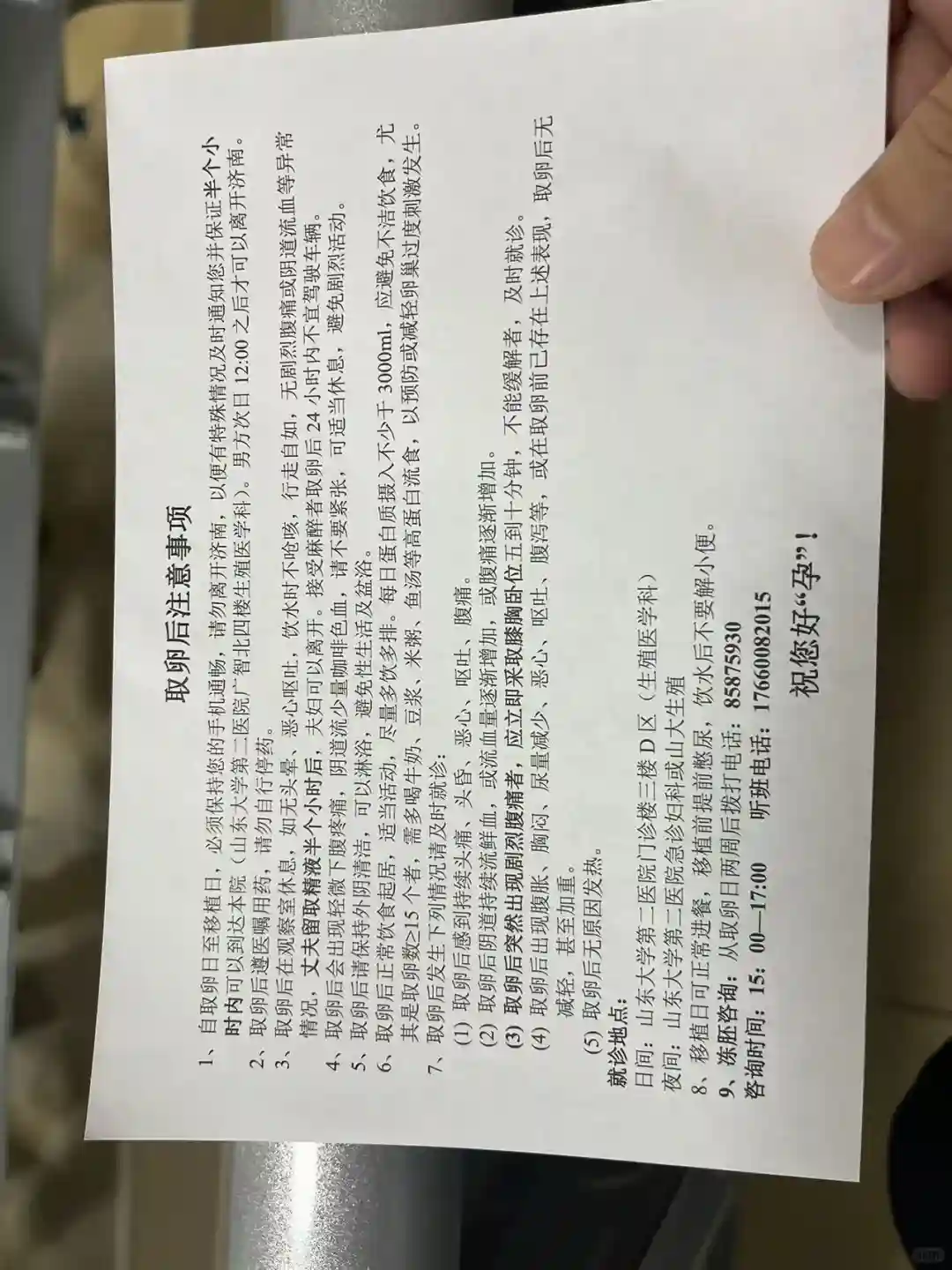 然后就是取卵后注意事项,尤其是一天要有3000毫升液体的摄入,护士小姐姐说的是其中1000毫升是蛋白质(牛奶、豆浆、鱼汤、蛋白粉之类的),1000毫升是电解质水或者椰子水或者大米汤、1000毫升是水。鲜胚移植的要喝到移植后14天查HCG那一天,冻胚移植的要喝到下一次来例假。我第一天喝完就开始拉肚子,不知道是不是那个椰子水和牛奶有点凉的原因,我还线上问诊了,宋主任让停甲硝唑,下午就不拉了,我就没停。今天喝完还是有点拉肚子,不过我觉得问题不大,应该是短时间内摄入的液体太多了。