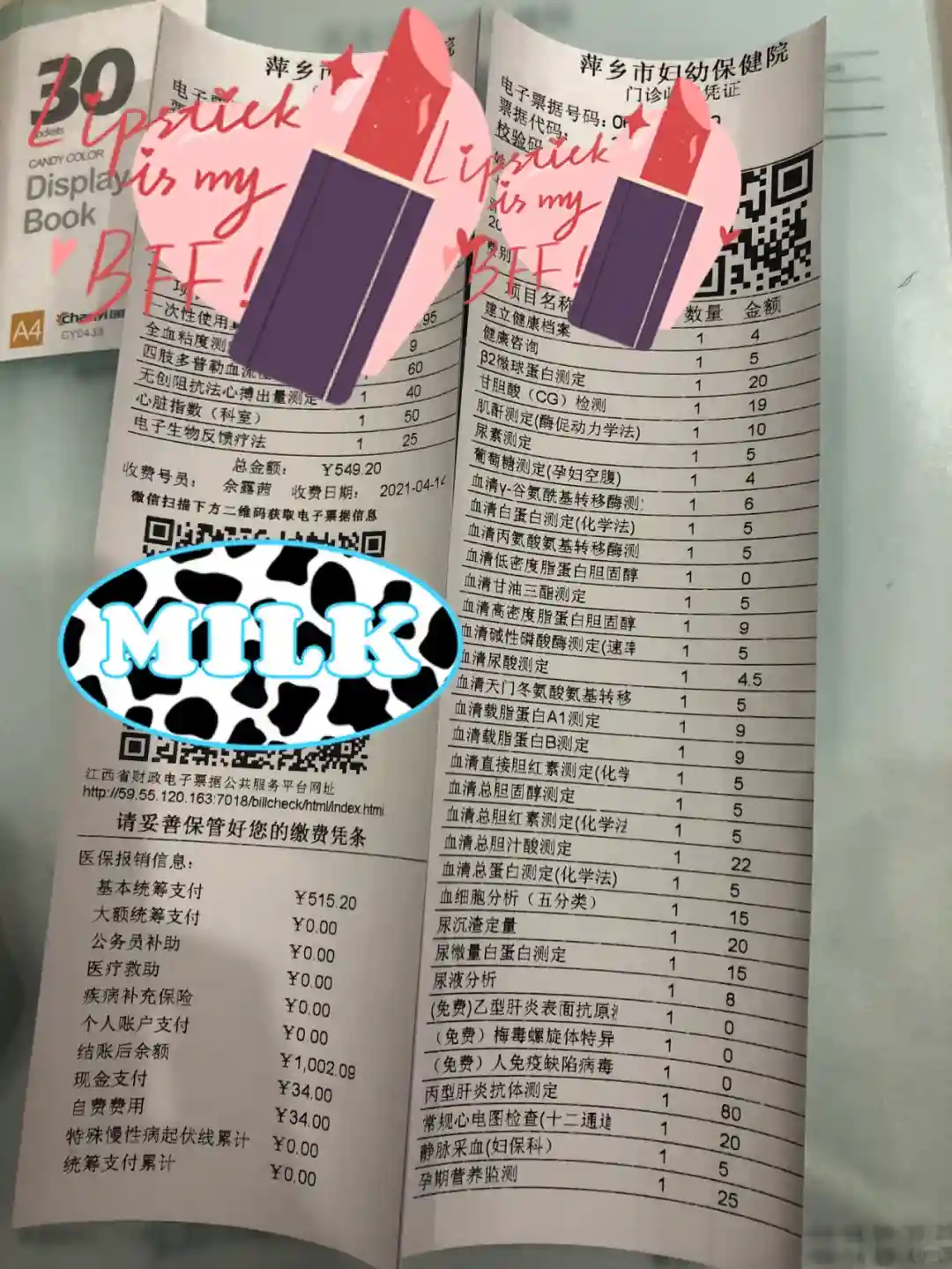 这次首先做了一个B超~142.5元(每个医院价格都不一样)确认怀孕后,之后的检查就可以使用生育险进行报销,还有一些检查,是免费的,单子上有。