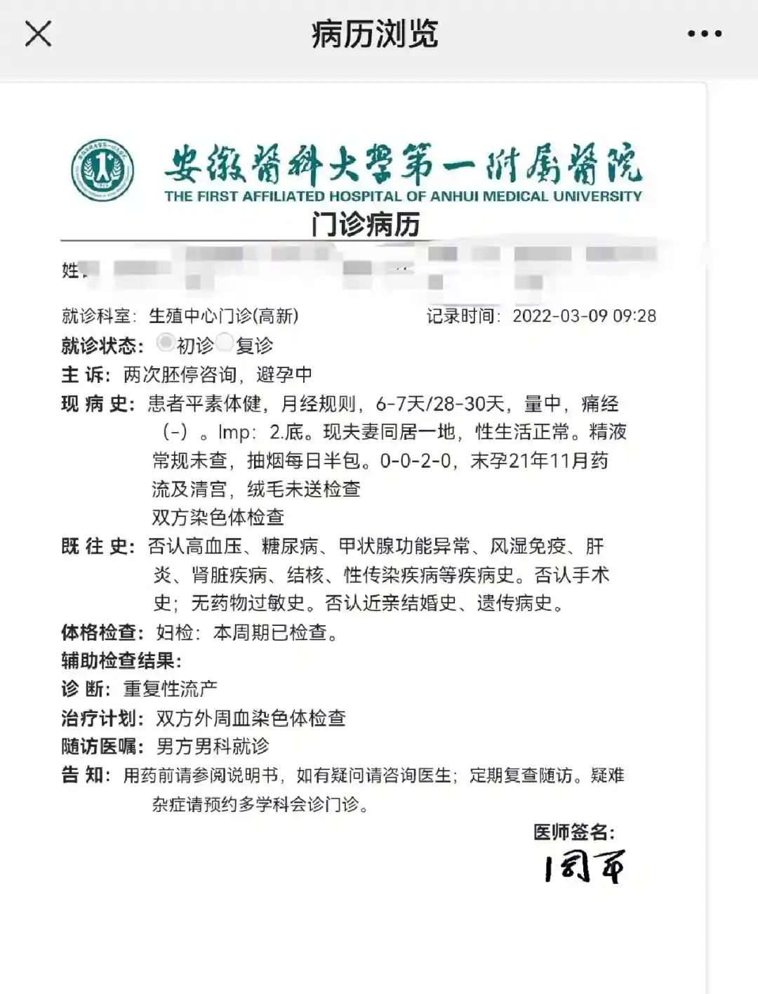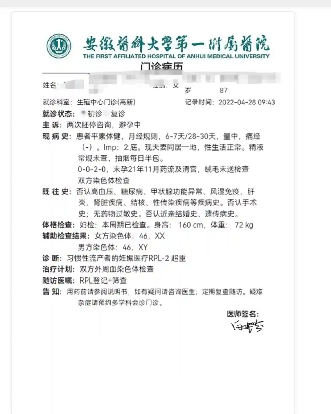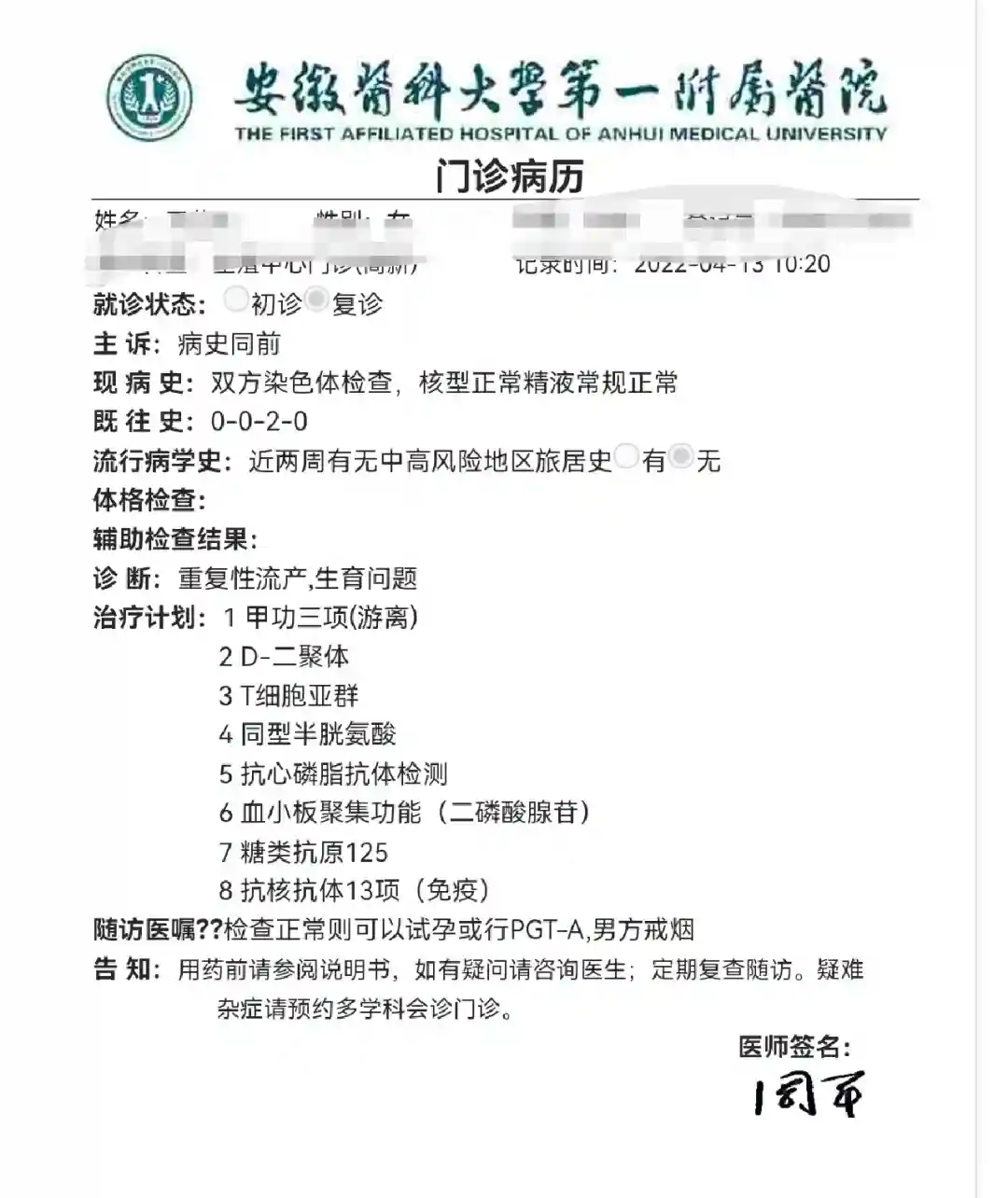 ②第2次去向主任那里看,全程只说了2句话,①胚胎染色体检查了没?说没有,②翻看之前检查结果说两次了都没检查?说是的,就让助理带我去登记,搞了好久填写各种数据,问助理要不要再开检查查查总不能一次也没个方案吧?她看看我有些没检查的项目,就给我开了空腹血糖检查,因为登记耽误太久空腹血糖没做成,等待2小时看诊1分钟登记30分,没什么收货,所以对她印象不是很好 男方检查也没问题 2022年4月③今年第3次,我再换医生看结果吧!再没个结果我感觉可以换医院了