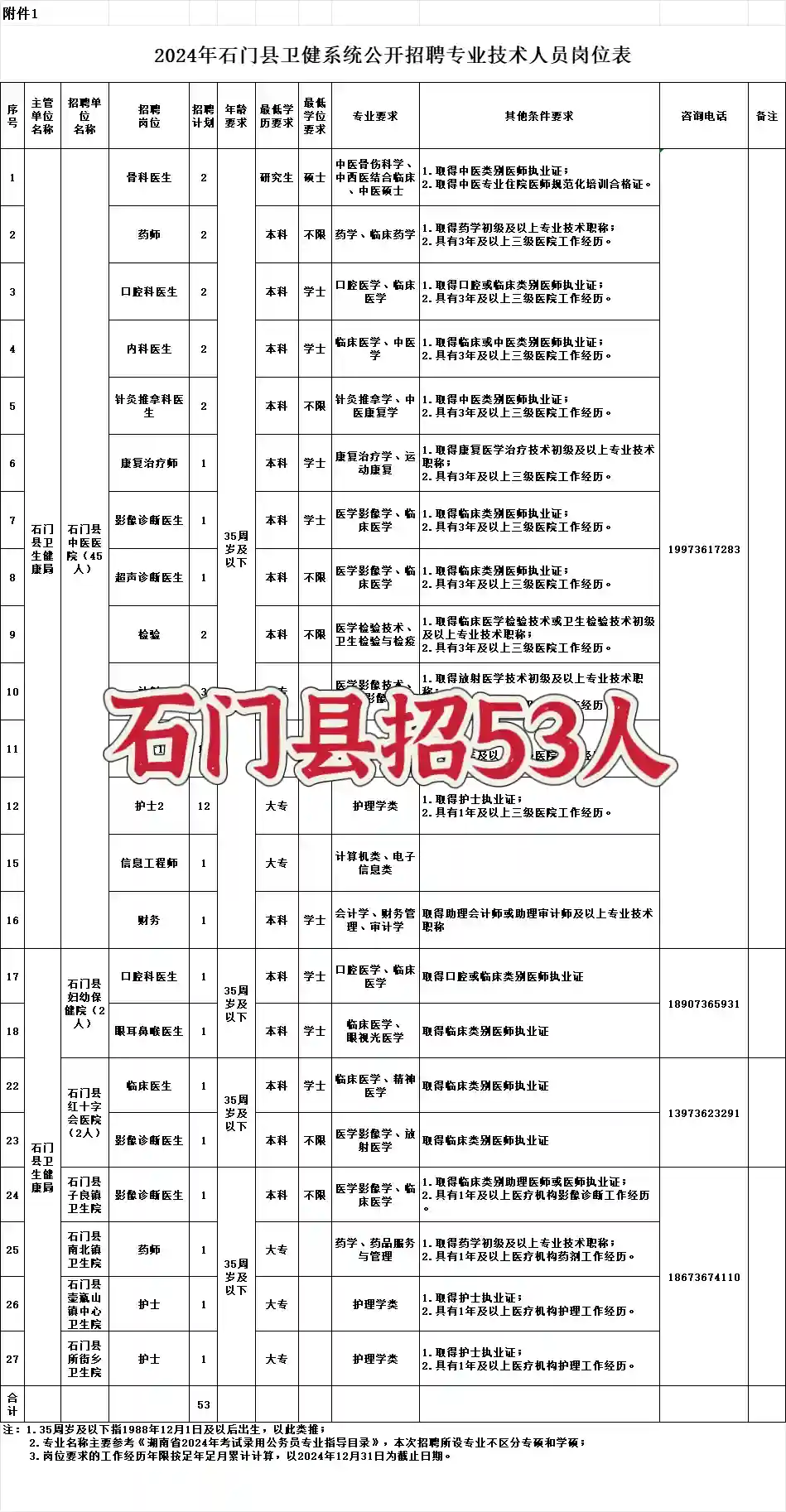 2024年常德市石门县招53人
