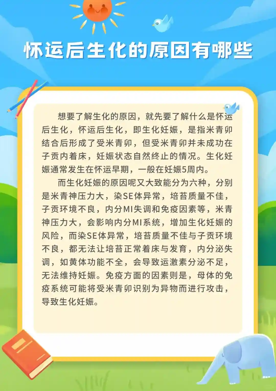 想要了解生化的原因,就先要了解什么是怀运后生化,怀运后生化,即生化妊娠,是指米青卯结合后形成了受米青卯,但受米青卯并未成功在子贡内着床,妊娠状态自然终止的情况。生化妊娠通常发生在怀运早期,一般在妊娠5周内。而生化妊娠的原因呢又大致能分为六种,分别是米青神压力大,染se体异常,培苔质量不佳,子贡环境不良,内分mi失调和免疫因素等,米青神压力大,会影响内分mi系统,增加生化妊娠的风险,而染se体异常,培苔质量不佳与子贡环境不良,都无法让培苔正常着床与发育,内分泌失调,如黄体功能不全,会导致运激素分泌不足,无法维持妊娠。免疫方面的因素则是,母体的免疫系统可能将受米青卯识别为异物而进行攻击,导致生化妊娠。