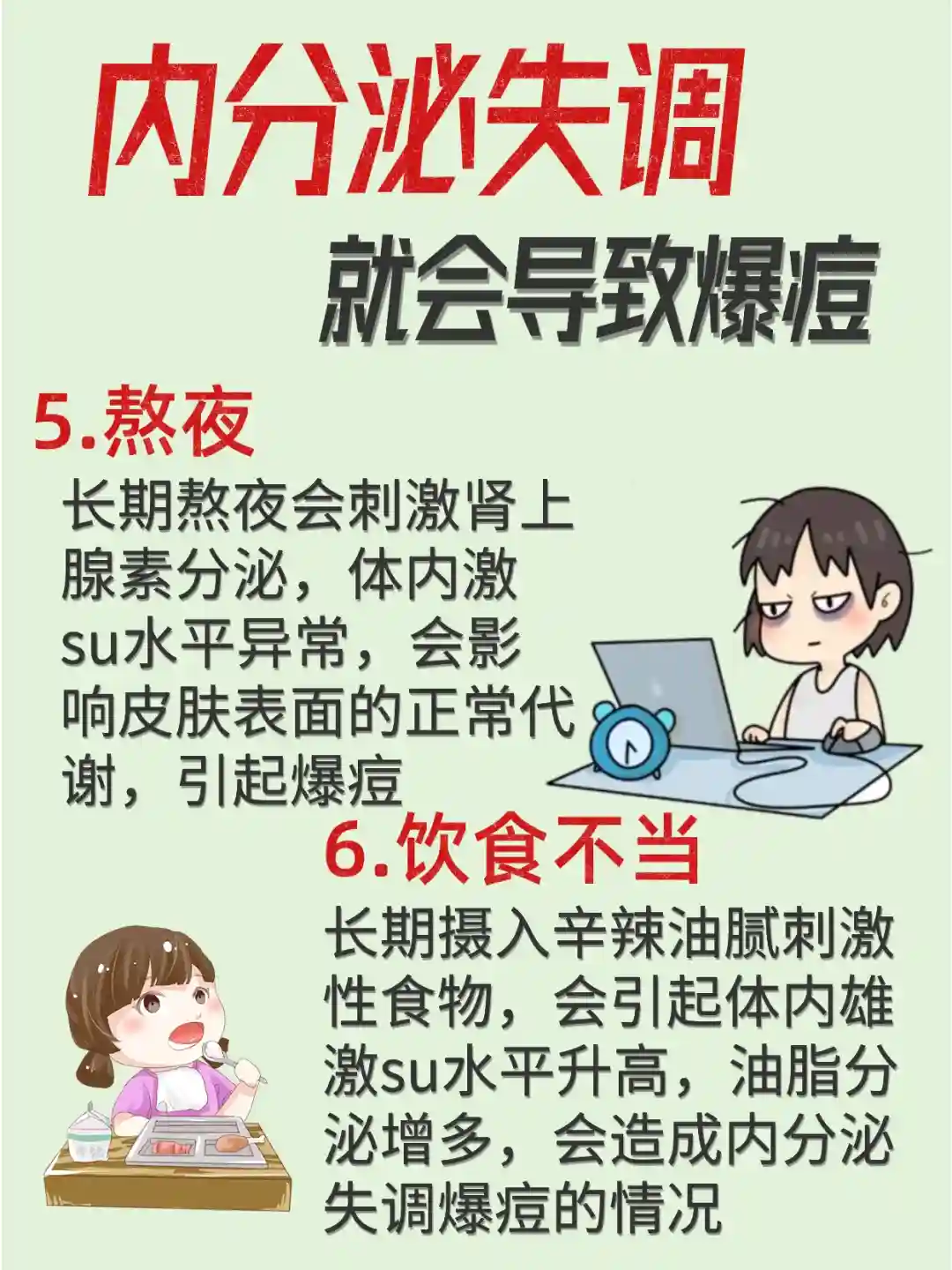 长期熬夜会刺激肾上腺素分泌,体内激su水平异常,会影响皮肤表面的正常代谢,引起爆痘