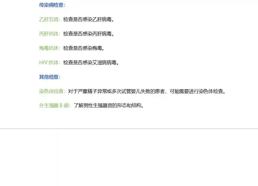 染色体检查:对于严重精子异常或多次试管婴儿失败的患者,可能需要进行染色体检查。