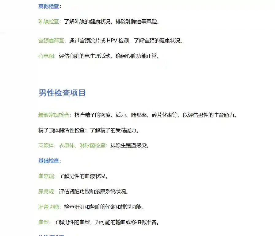 血常规:了解女性的血液状况,包括血红蛋白、白细胞、血小板等。