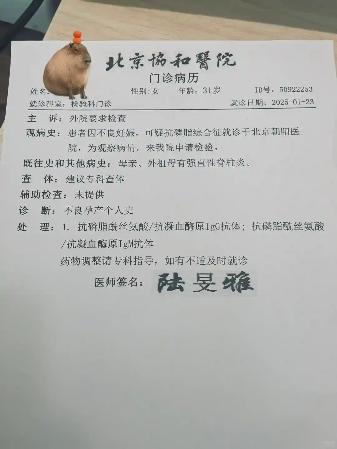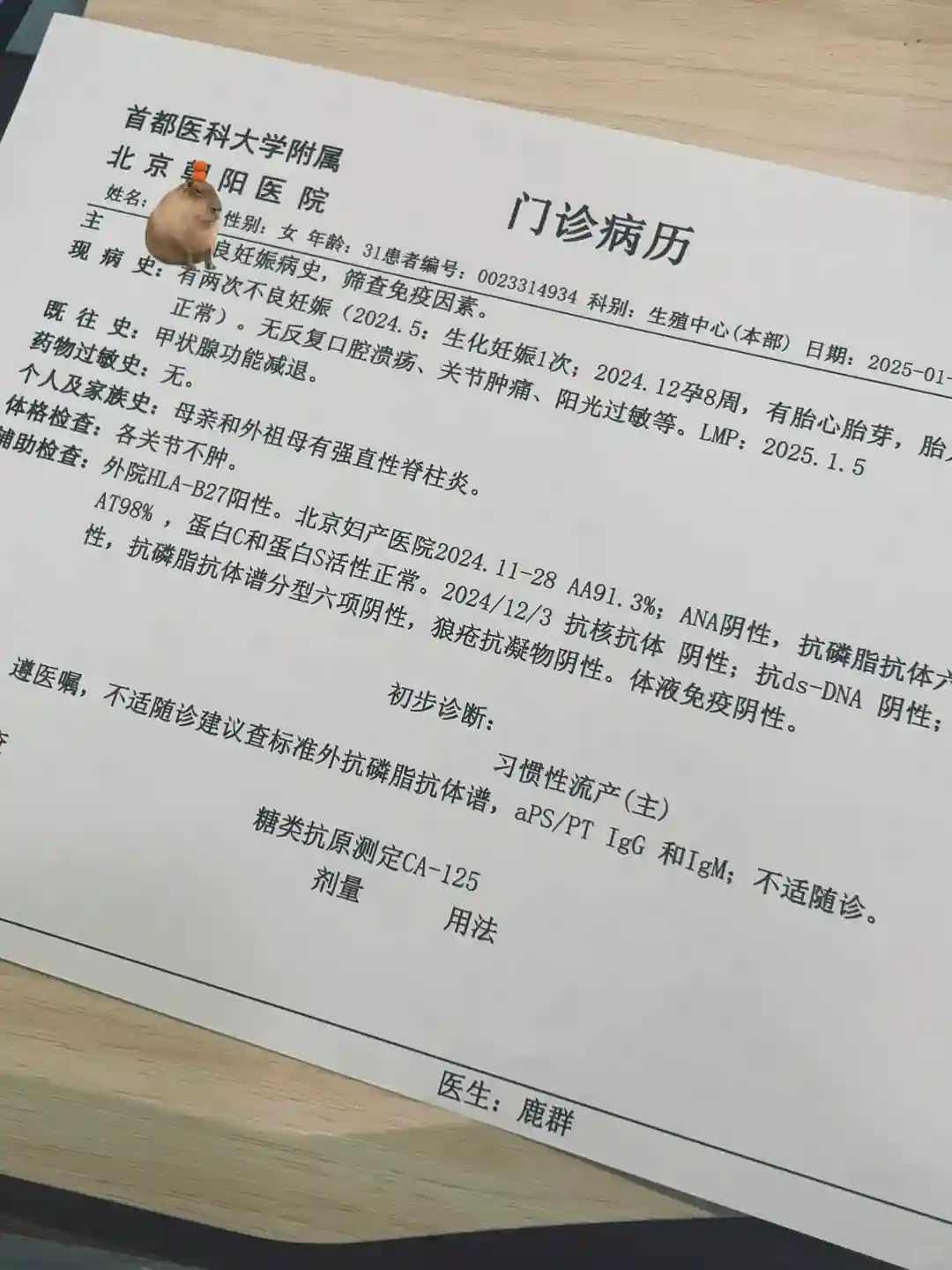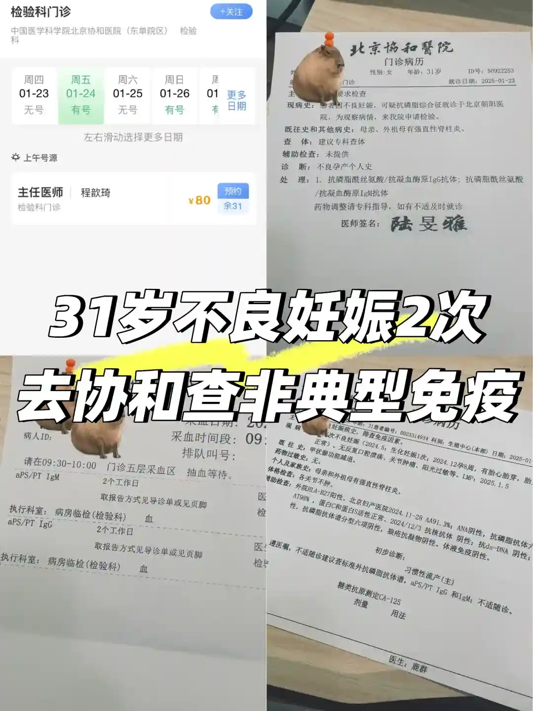 孕时在北京妇产医院和朝阳医院都有做一些免疫方面的检查都是正常的,由于北京妇产医院对于这方面过于佛系,流产来例假后果断去朝阳医院再此进行检查,挂了风湿免疫科孟娟和生殖中心鹿群,两位都是特别好的温柔的医生,都可以走医保。