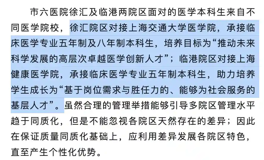 4.第六人民医院临港院区(有意思的,六院临港最早以独立法人形式作为上健医附属医院,2021年由分院变为院区,而六院是交大附属医院。一篇《中华医学教育探索》文章为我们解惑,里面提到“徐汇院区对接上海交通大学医学院,承接临床医学专业五年制及八年制本科生,临港院区对接上海健康医学院,承接临床医学专业五年制本科生)