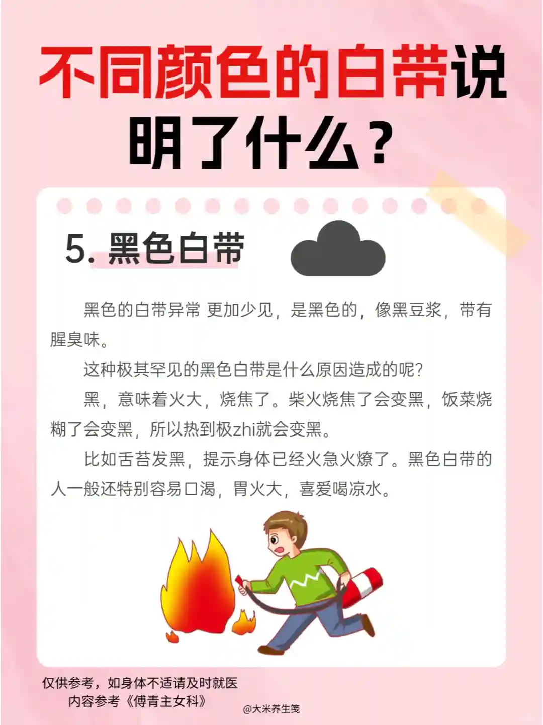 比如舌苔发黑,提示身体已经火急火燎了。黑色白带的人一般还特别容易口渴,胃火大,喜爱喝凉水。