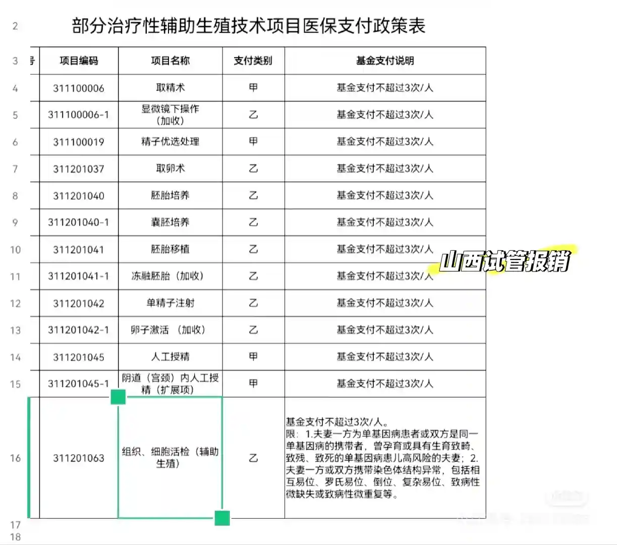 2.检查项目中有图片中13项的发票(注意:取精术和精子优选处理只有用男方的医保才可以报销,如果发票和其他项目在一起的话需要去医院重新开一下)