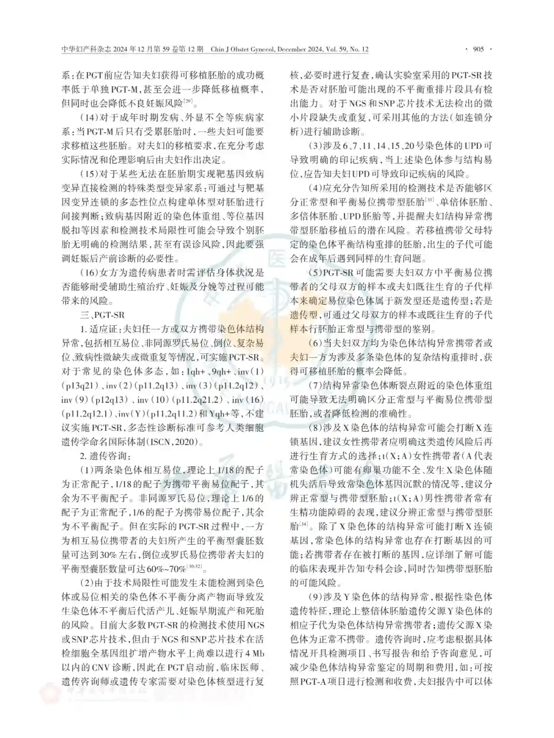 11. 小片段(臂内倒位片段占整条染色体的比例<35.7%,臂间倒位片段占整条染色体的比例< 57%)的染色体倒位由于减数分裂过程中很少导致相应染色体部分单体和部分三体配子,充分知情同意下,夫妇双方可考虑自然妊娠后行产前诊断,而不选择PGT-SR。