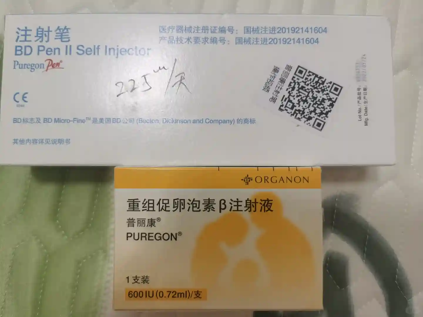 只想着贵一点可能没那么痛然后选择了肚皮针,然后就是医生写处方单,出去外面买药,回来护士会教怎么打,我是每次打225个单位的。护士小姐姐说这个针写着600每支但其实会多送的估摸着写600可能会有700,所以我一支可以打三天(225*3=675)最近几天就是要扎两针了,一个降调的一个促排的