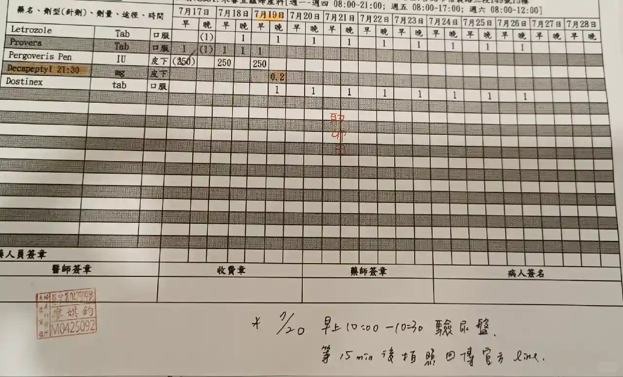 另外為了讓卵子可以長的更好,要再多打兩天的倍孕力跟吃排卵藥,禮拜三的晚上要打夜針(破卵針)2支,隔天禮拜四需要驗尿,並將驗尿盤照片傳給婦產科,確認是否可以照常取卵。